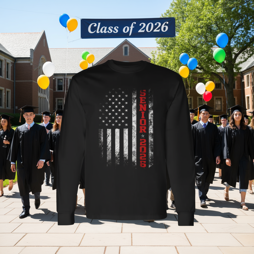 Maglietta a maniche lunghe con bandiera americana Senior 2026, classe di laurea 2026