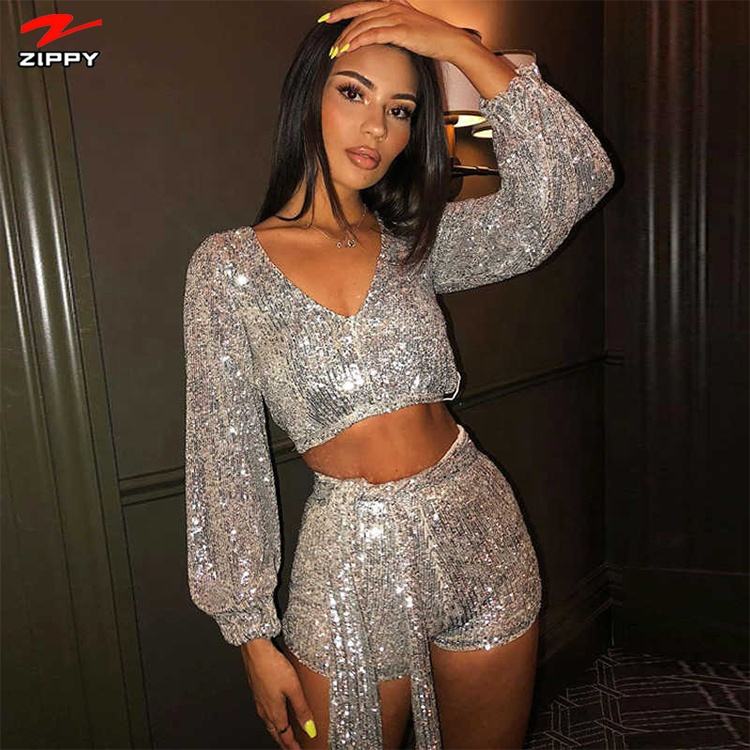 Top sexy con scollo a v con paillettes grigio con motivo costume completo da donna con paillettes club 2 pezzi set pantaloncini crop top