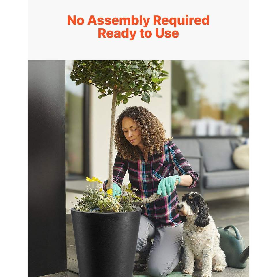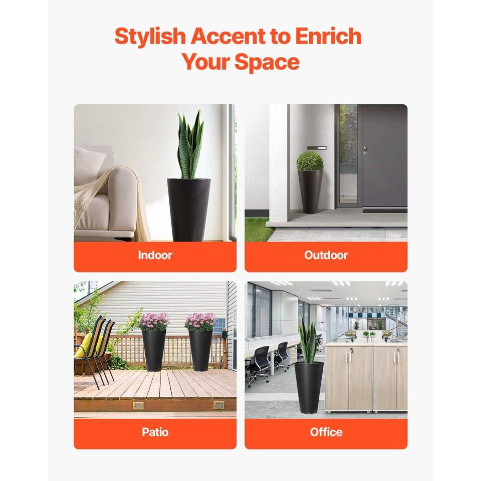 Set 2 Modern Design 24-inch Tall Taper Flower Tree Plant Pots Indoor/Outdoor Black Large Planters Built-in Drainage for Front