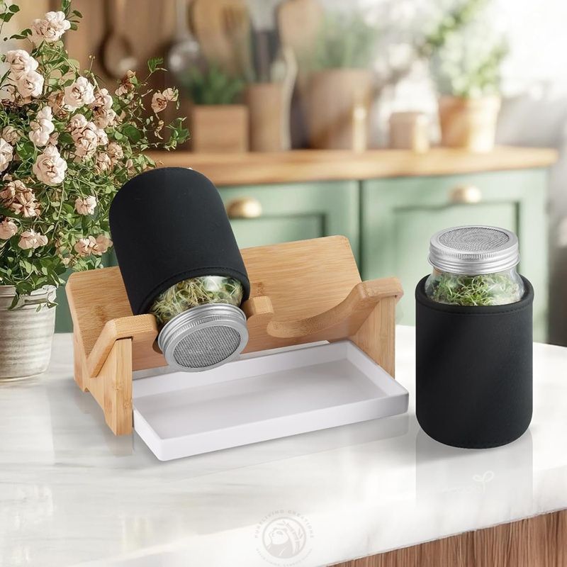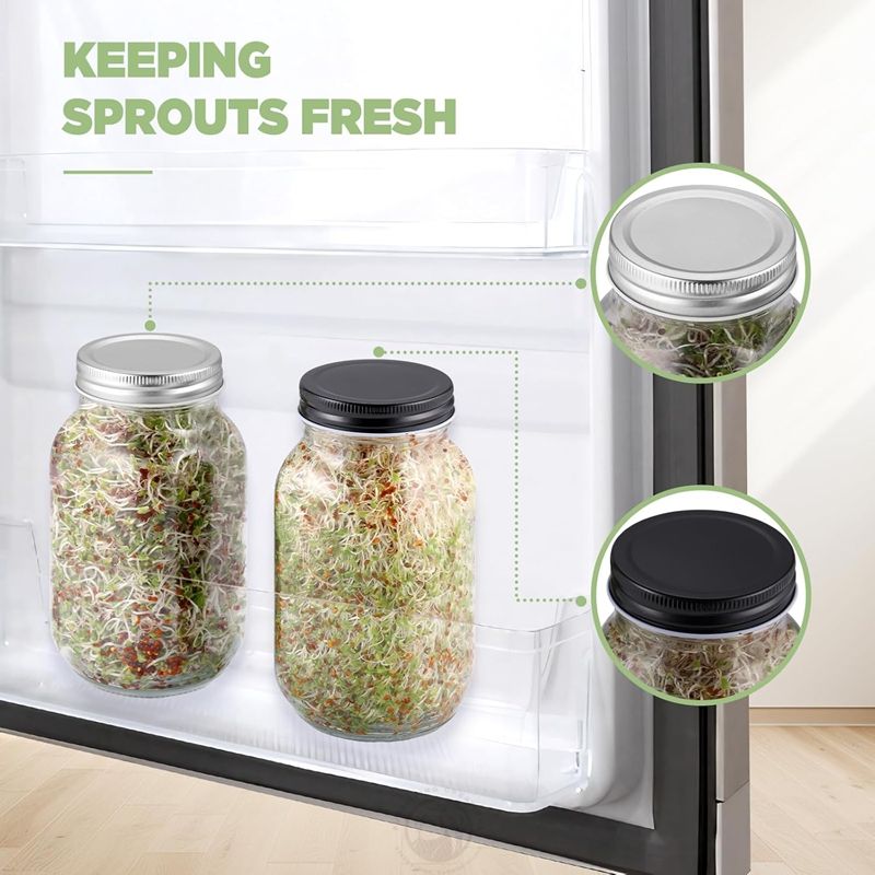Set di 2 Kit per Germogli con Barattoli Mason a Bocca Larga, Supporto in Bambù, Coperchio in Acciaio Inox - Ecologico e di Grande Capacità per Conservazione di Broccoli e Alimenti