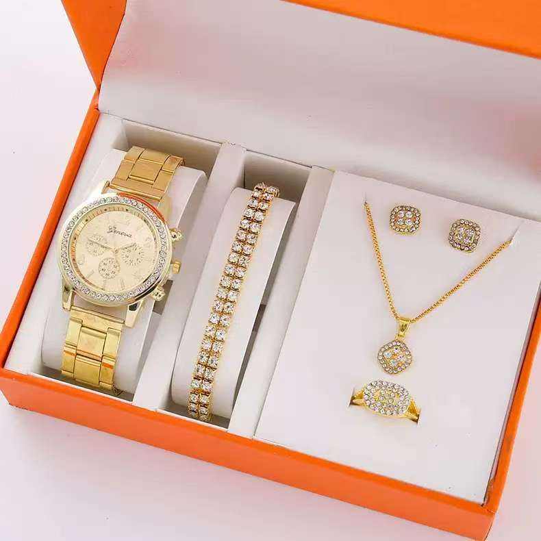 Set 5pcs Women's Casual Korean Quartz Watches Steel Strap Luxury 10mm Alloy Case Printed Logo/Pattern Orange Glass Dial Window