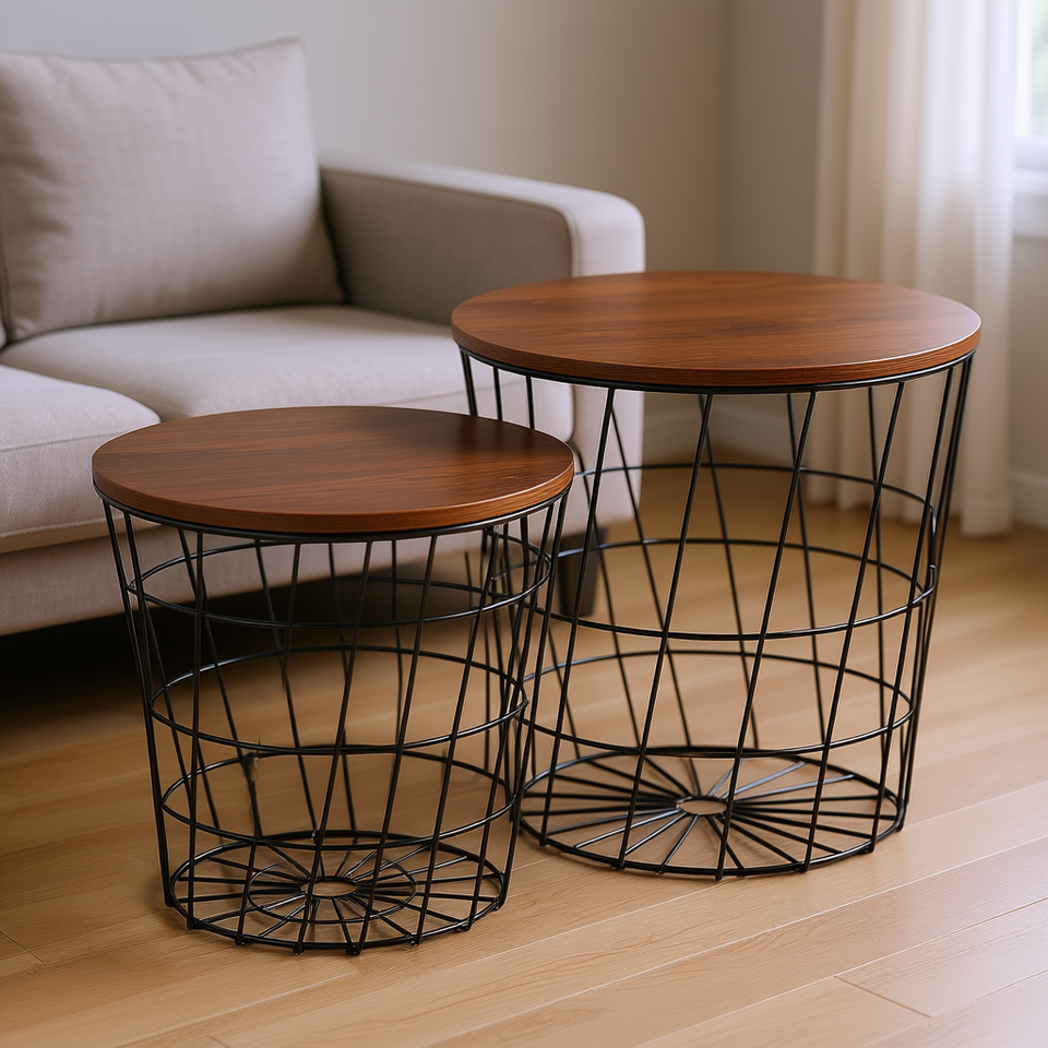 Set di 2 tavolini impilabili con piano rimovibile e vano portaoggetti, tavolini d'appoggio per soggiorno e camera da letto, in metallo nero e marrone