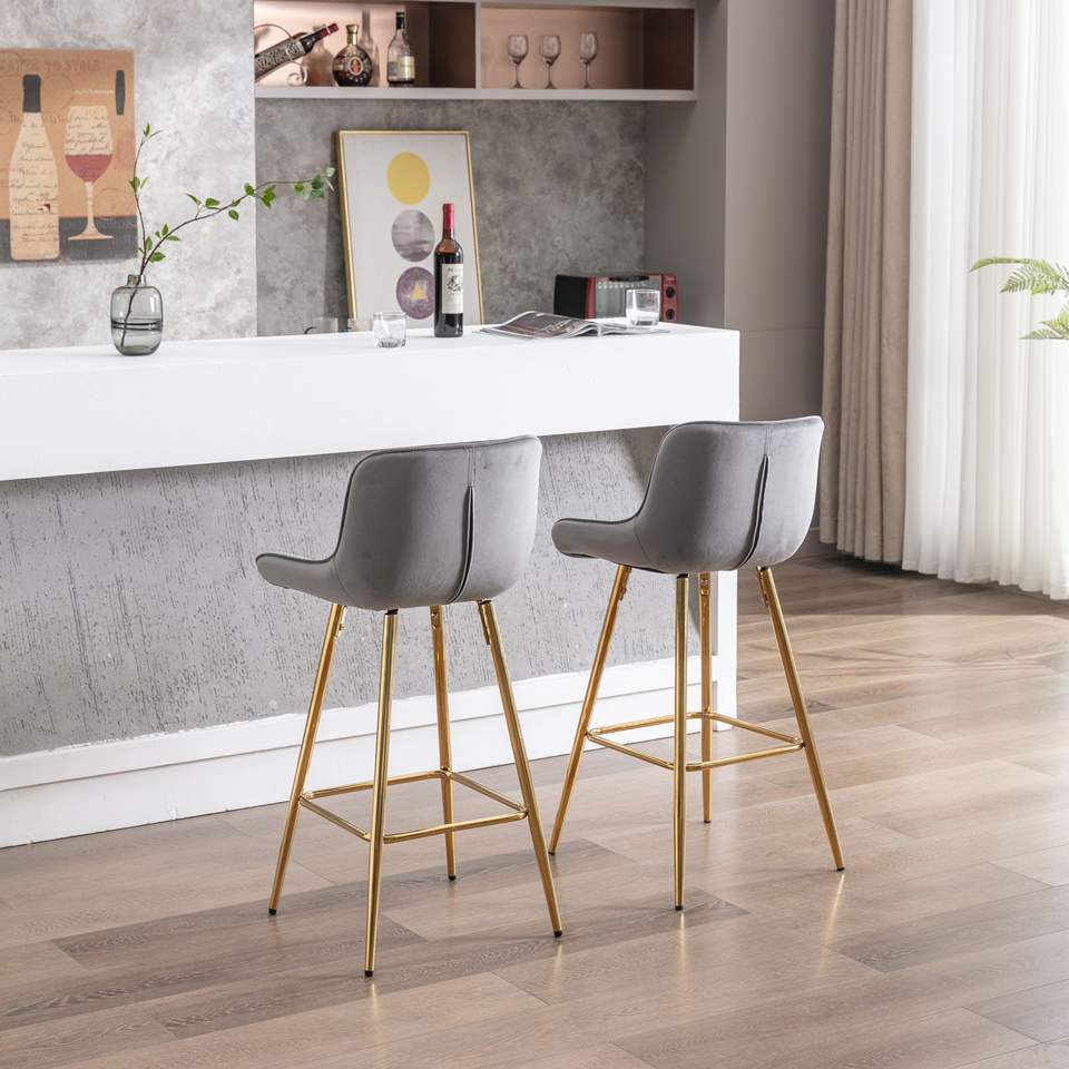 Set di 2 sgabelli da Bar da 26 pollici con poggiapiedi cromato e sgabello da banco in velluto dorato in tessuto grigio