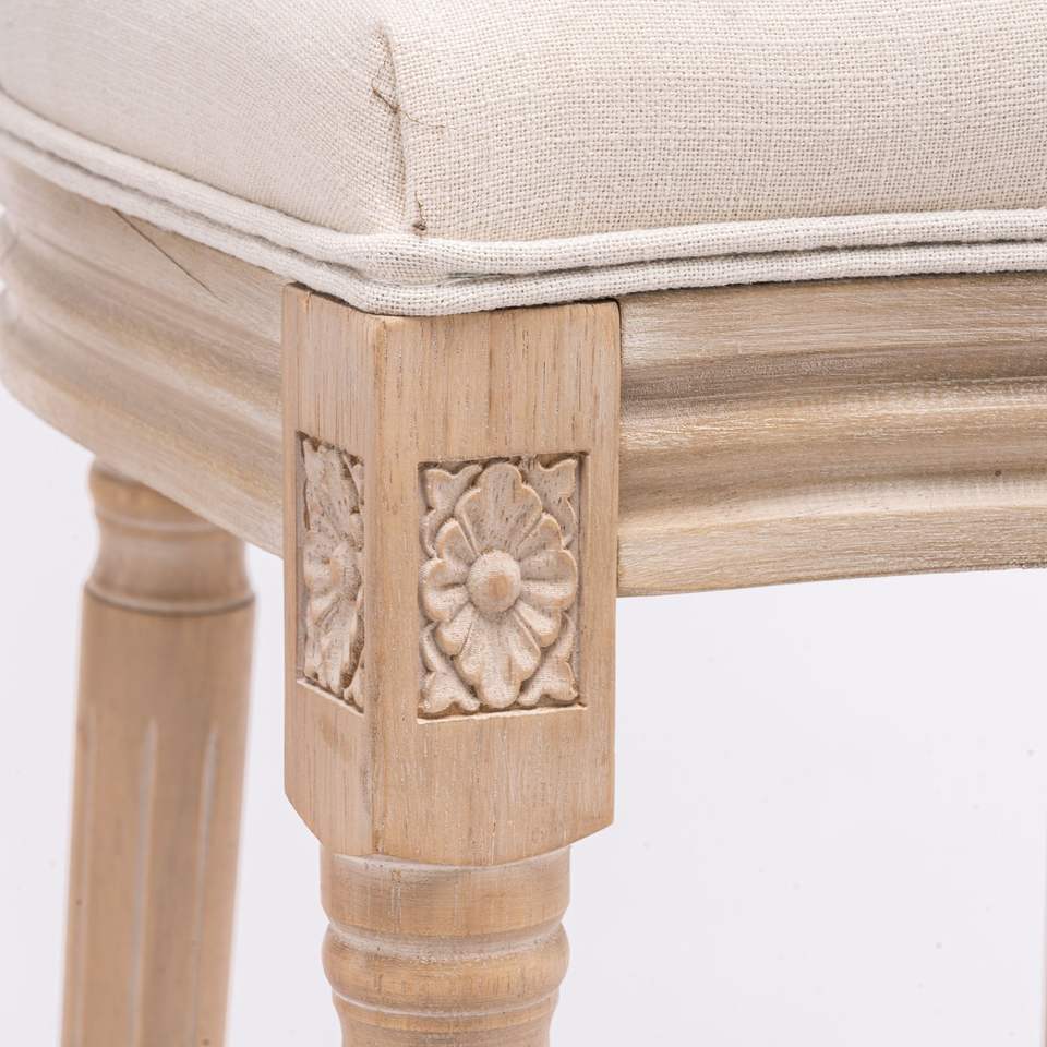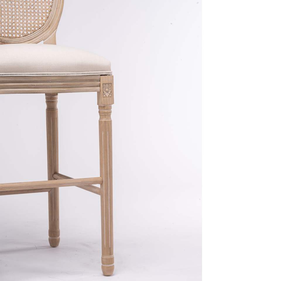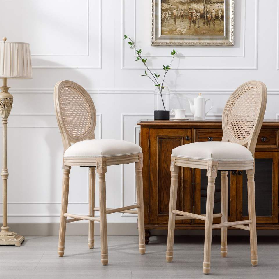 Set of 2 French Country Bar Stools Wooden with Rattan Back & Beige Upholstered Seating Natural Color