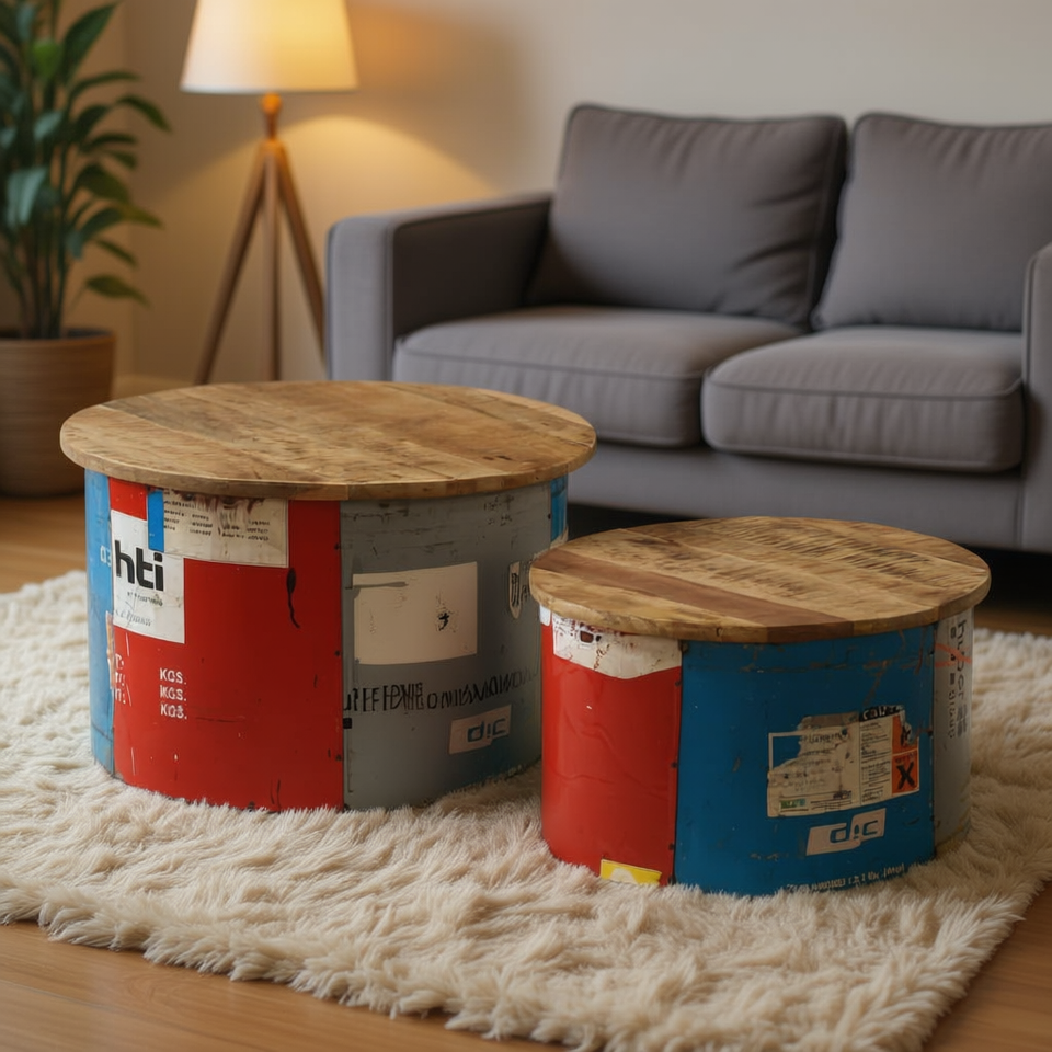 Set di 2 tavolini da caffè in legno di mango multicolore, stile industriale, design antico, mobili per soggiorno