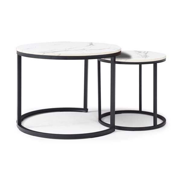 Set di 2 Tavolini da Caffè Rotondi in Legno con Motivo Marmorizzato, Struttura Nera e Piano Bianco-Grigio per Soggiorno e Camera da Letto