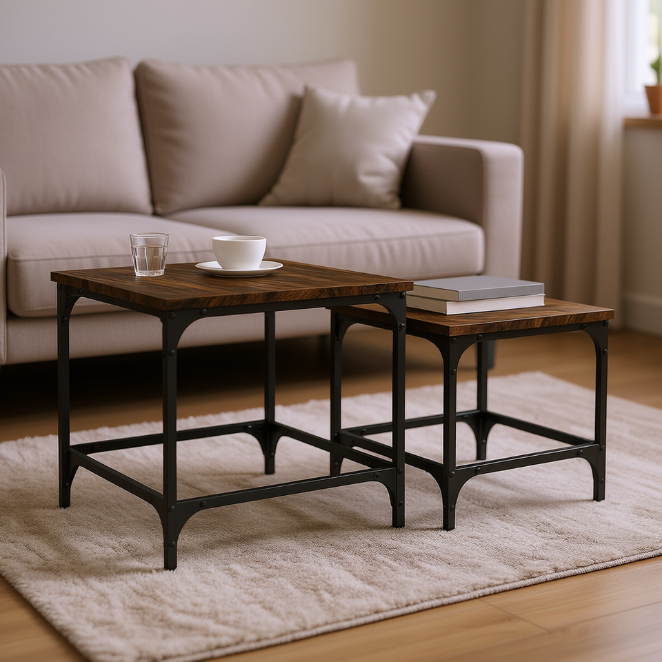 Set Of 2 Smoked Oak Engineered Wood Nesting Coffee Tables Industrial Modern Design Iron Frame Living Room Furniture