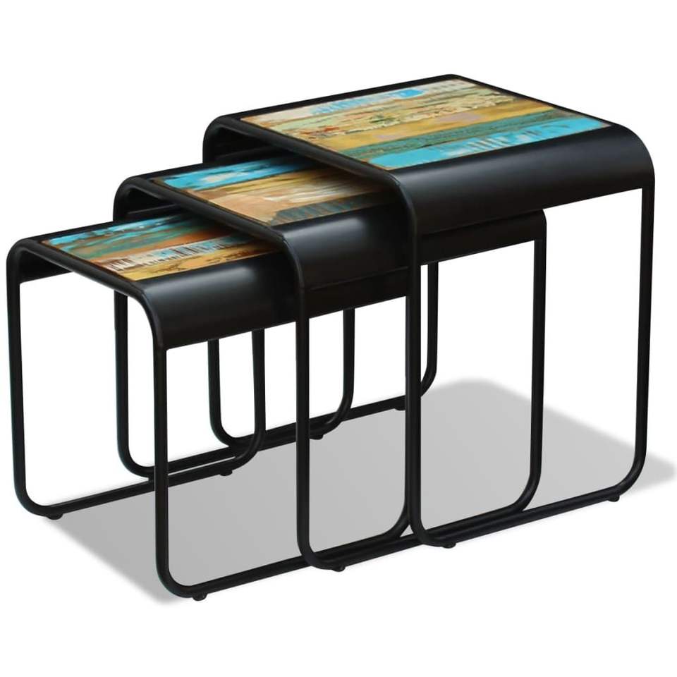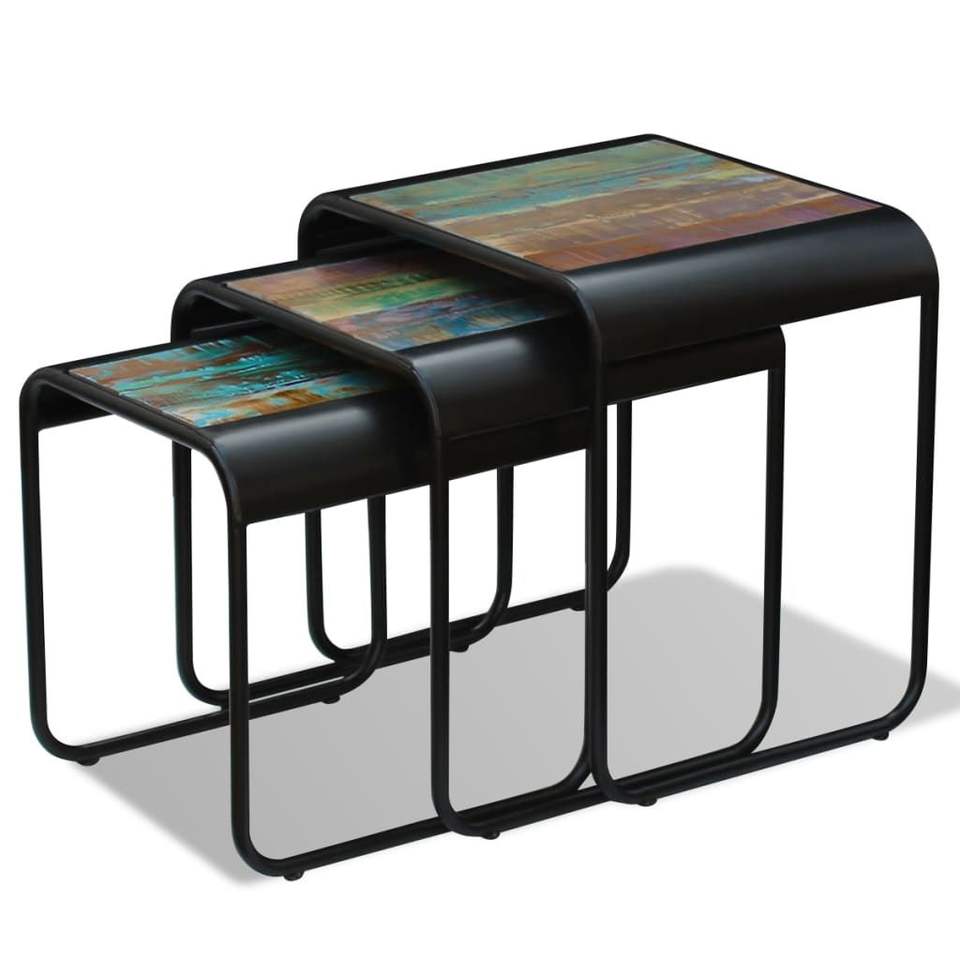 Set di 3 tavolini da caffè multicolore in legno massello di recupero e acciaio, tavolini laterali multicolore in legno di recupero e acciaio