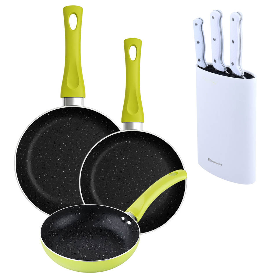 Set di 3 padelle San Ignacio (20+24+28cm) in alluminio pressofuso verde + Set di 3 coltelli con manici in acciaio inossidabile