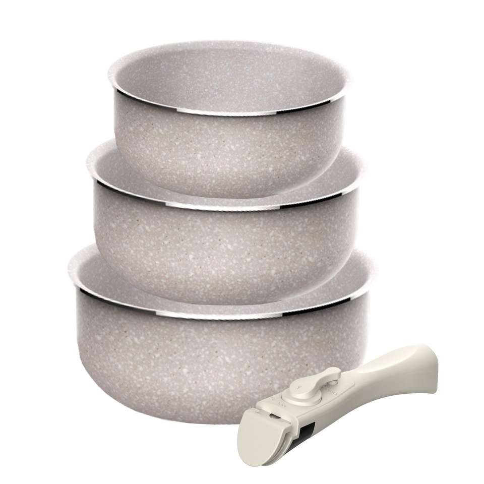 Set di 3 pentole 16/18/20 cm in alluminio pressofuso, rivestimento antiaderente ILAG, manico rimovibile, adatte per induzione, senza PFOA.