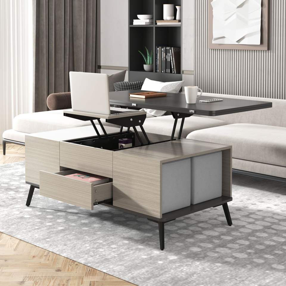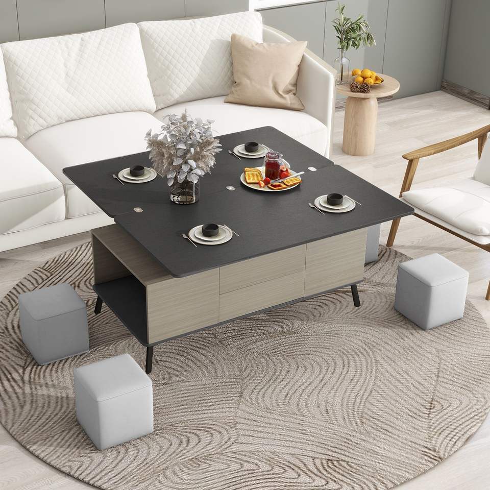 Set of 5 Convertible Lift Top Coffee and Dining Tables with Storage Ottomans for Multi-Purpose Use