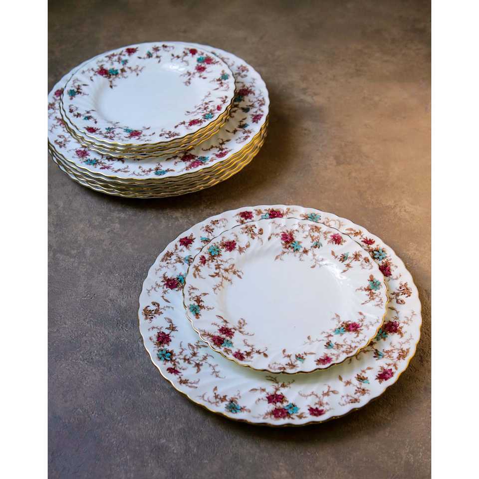 Set di 6 + 6 Piatti in Porcellana Minton con Decorazione Ancestrale e Bordo Effetto Invecchiato 20cm e 26cm