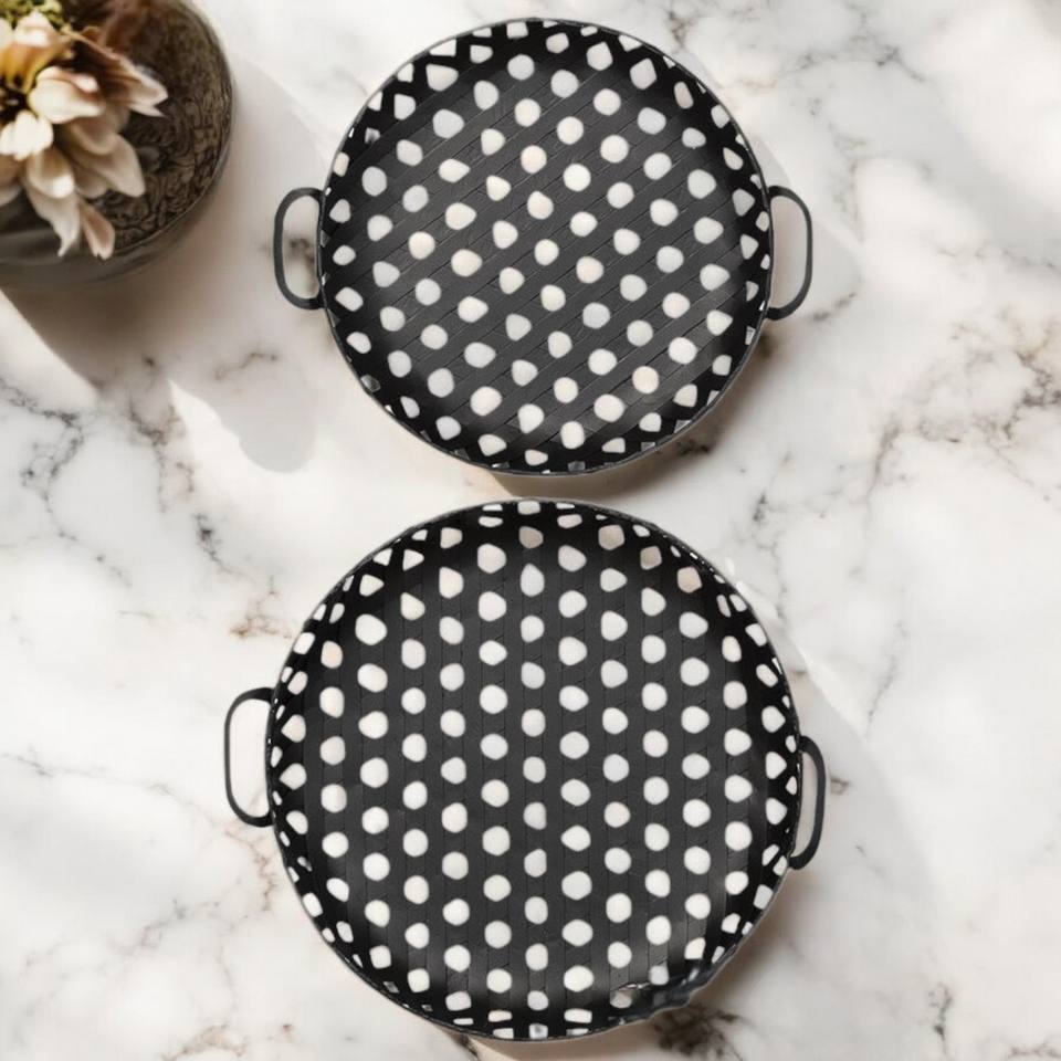 Set of Two Black Round Metal Serving Trays with Handles for Indoor and Outdoor Use