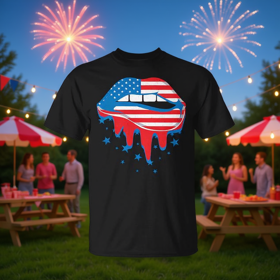 T-shirt sexy con labbra che sfiorano e gocciolano, bandiera americana, 4 luglio