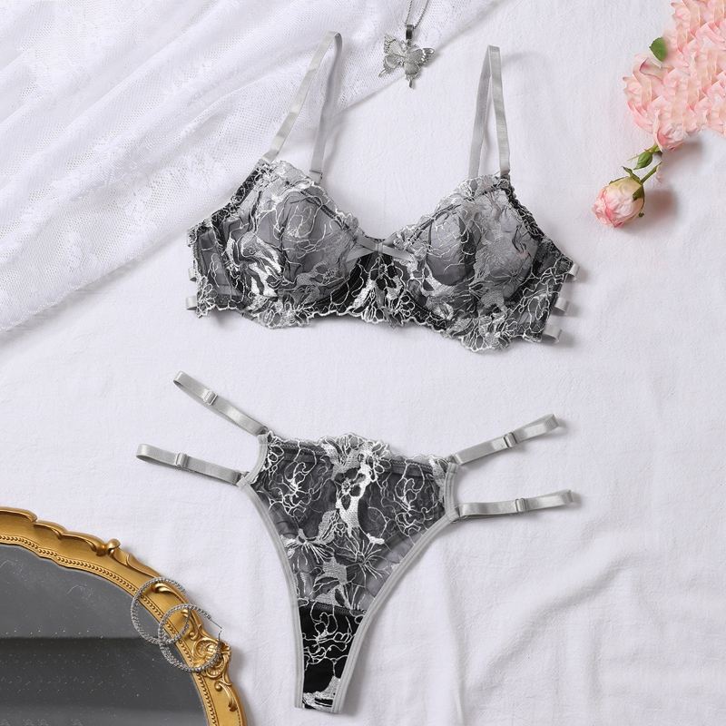 Completo Intimo Sexy Nero Grigio con Motivo Floreale in Pizzo Eco-Friendly, Bralette Modellante Leggera e Perizoma, Set 2 Pezzi Trasparente da Donna