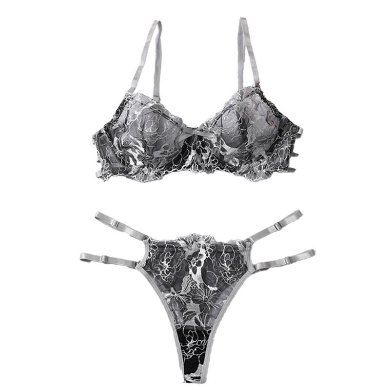 Nome del prodotto:Set di Lingerie Trasparente con Motivo Floreale Nero e Grigio
