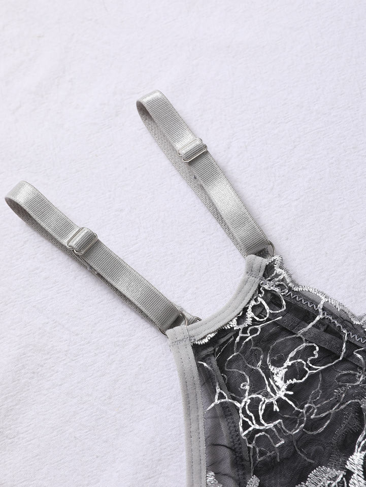 Set di Lingerie Trasparente con Motivo Floreale Nero e Grigio