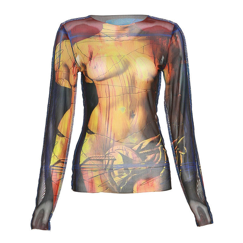 Sexy Body Print T-Shirt Women Skinny Elastic Midnight Party Long Sleeve O-Neck Crop Top Wild Streetwear Coquette Tees