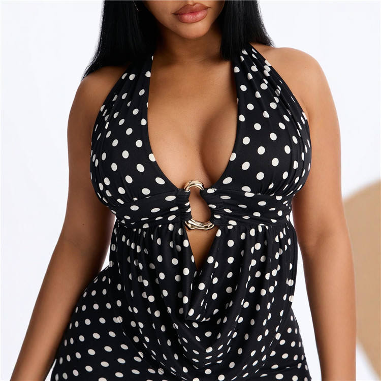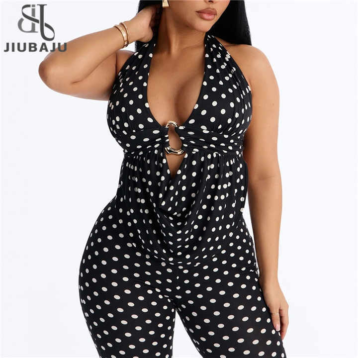 Set Sexy alla Moda in Due Pezzi per Donna, Top con Stampa a Pois e Colletto Halter Metallico, Pantaloni Aderenti, Completo da Strada per Ragazze Trendy