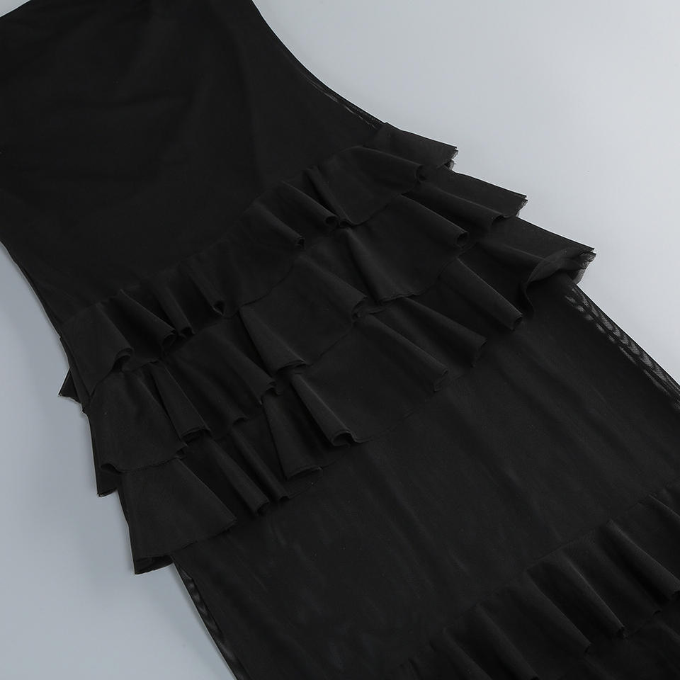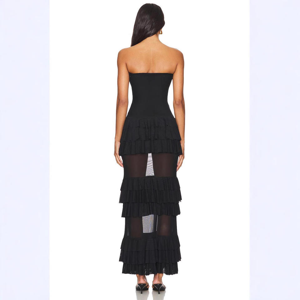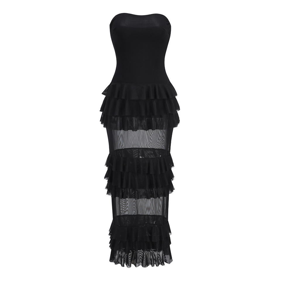 Sexy French Hollow Lace Long Dress, Fashionable Strapless Solid Color Spicy Girl Cake Long Dress