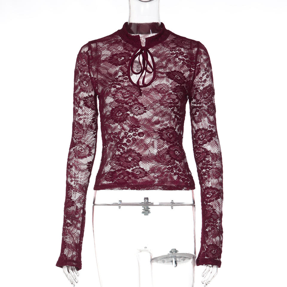 Sexy Front Hollow Out Long Sleeve Black Lace Crop Tops Elegant Ladies Women Fashion Blouses and Shirts Wholesale Price