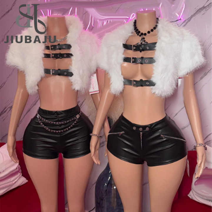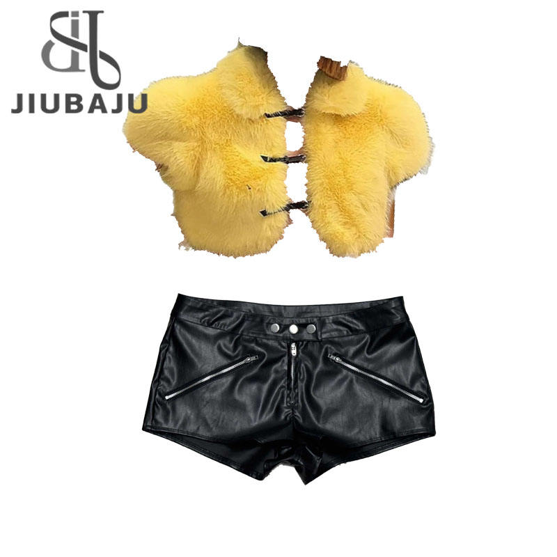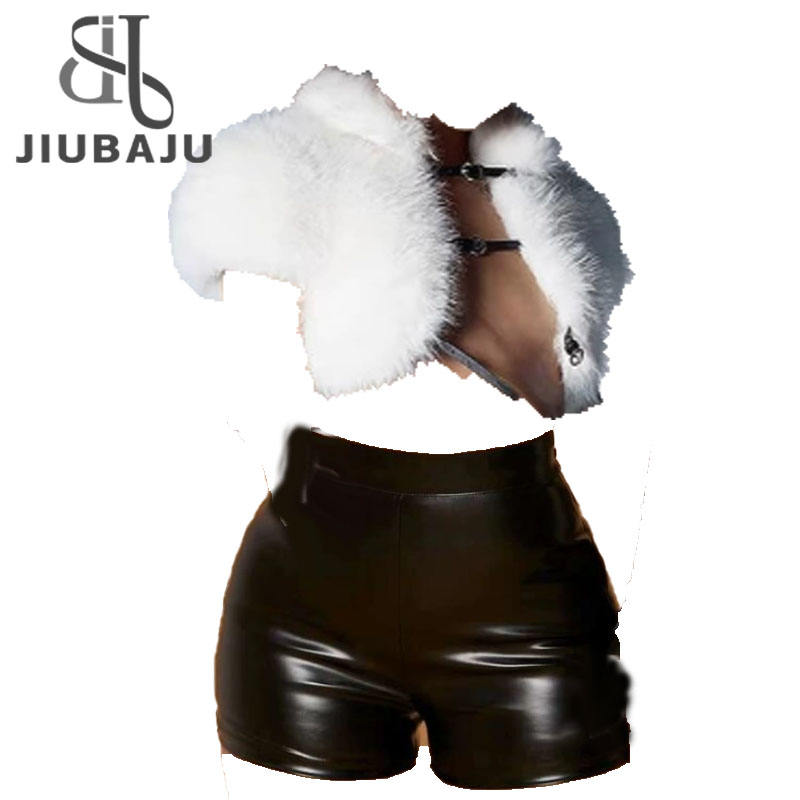 Sexy Fur Stand Collar Vest Hollow Two Piece Sets Women Cardigan Jackets Tops and PU Leather Shorts Outfit