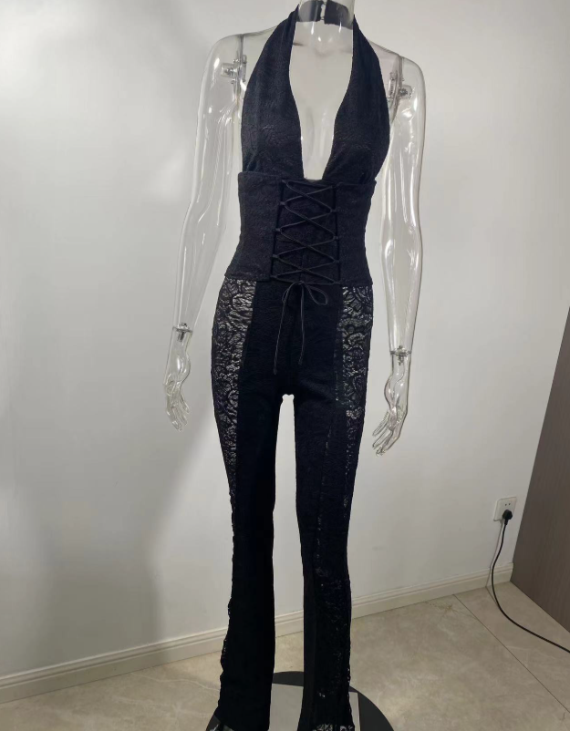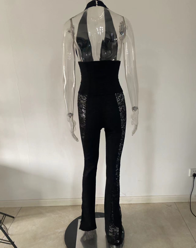 Sexy Halter Neck Backless Black Lace Women Bodycon One Piece Rompers Play Suits Casual Women Street Wear Tight Jumpsuits