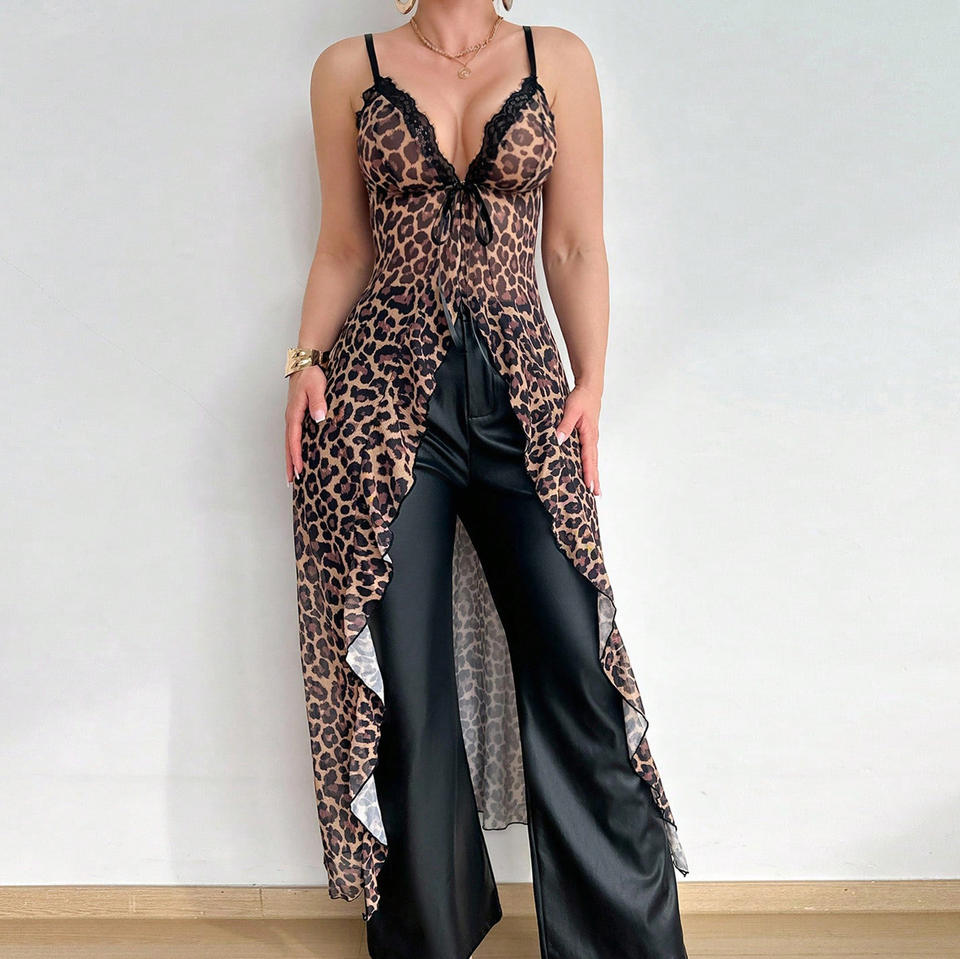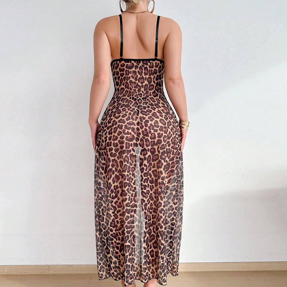 Camicia da notte sexy in pizzo, rete trasparente con stampa leopardata, seducente abbigliamento da club e da notte per donne, per la notte di nozze