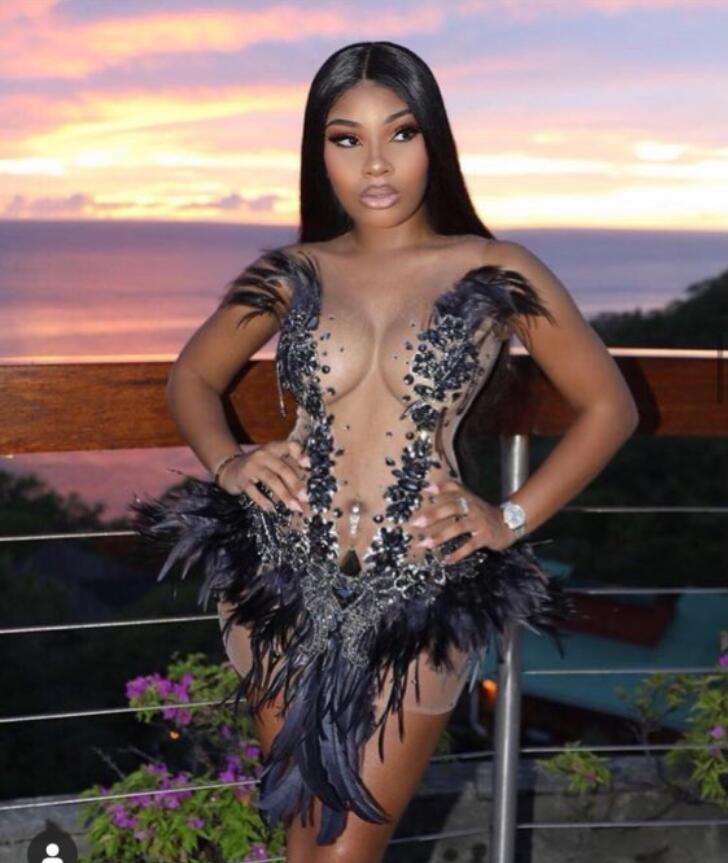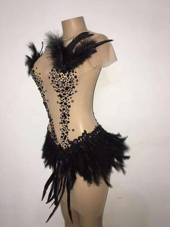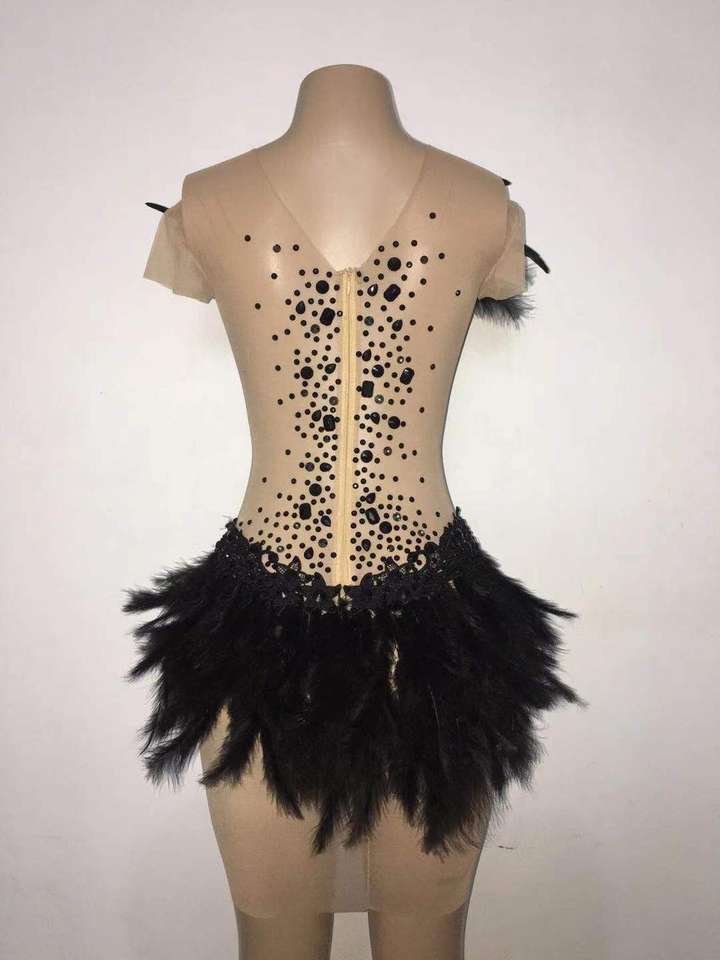 Sexy Mesh See Through Rhinestones Black Feather Dress Dance Costume Prom Birthday Celebrate Dresses