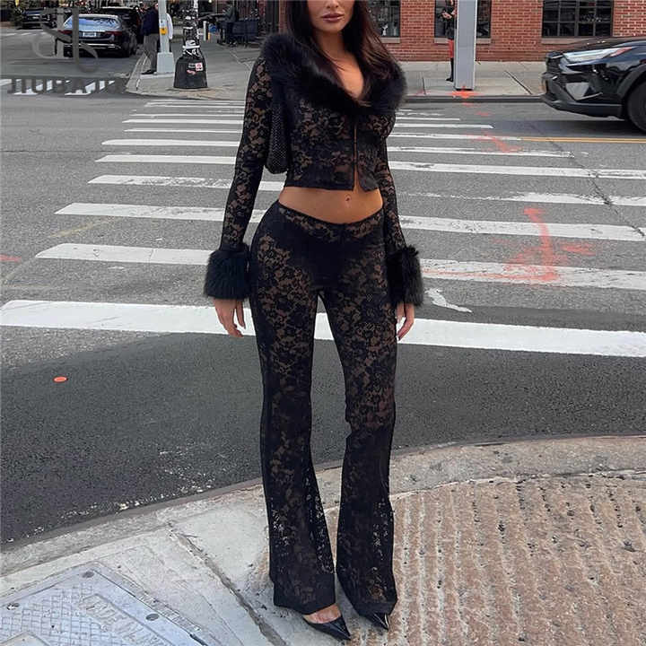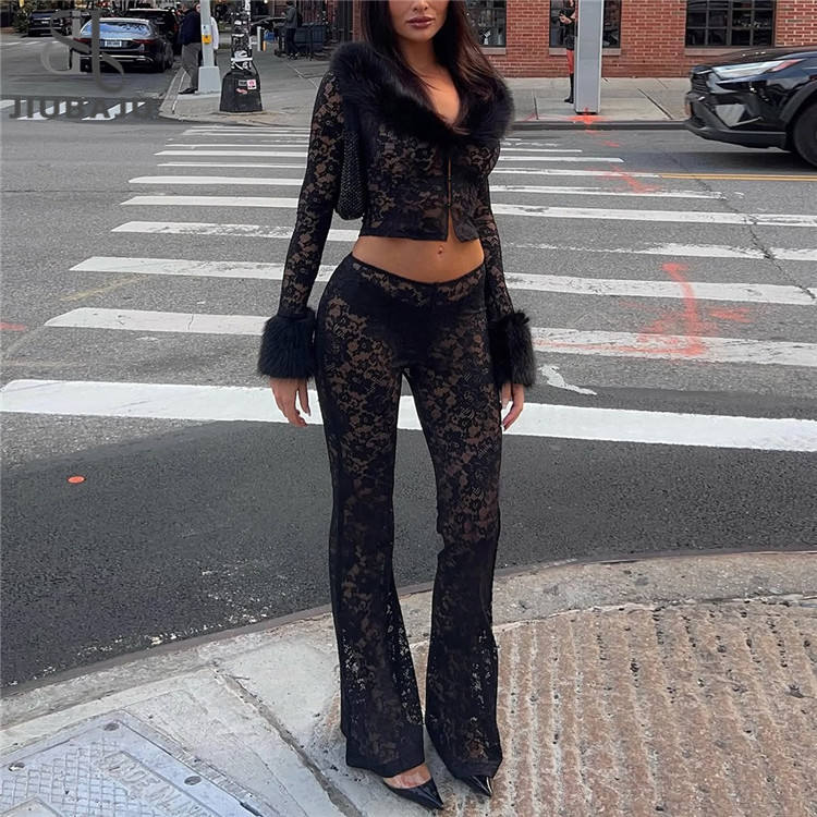 Sexy Patchwork Women 2 Piece Set Jacquard Fur Single-Button Jacket+Flare Pants Matching Midnight Party Clubwear Suits