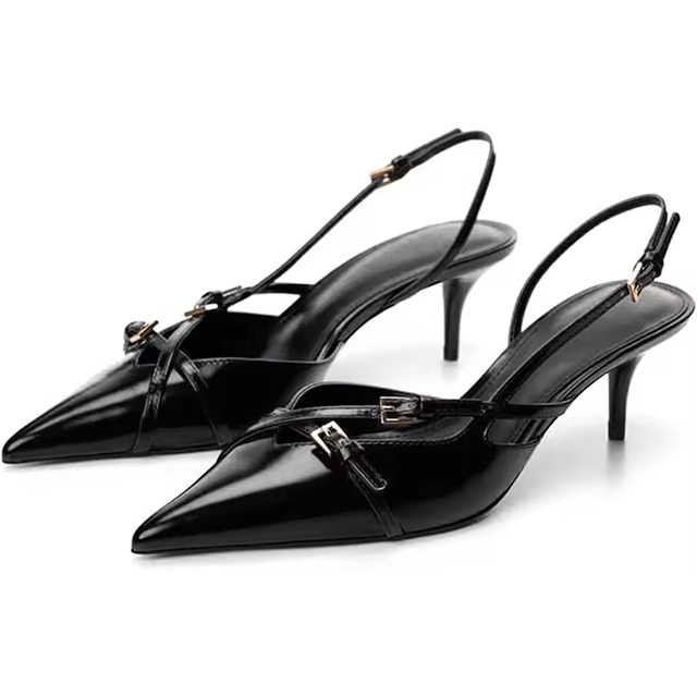 Sandali Sexy con Tacco Alto in Pelle Nera, Punta Affusolata e Doppia Cinturino con Fibbia, Suola in PU, Tacco a Spillo, Slingback