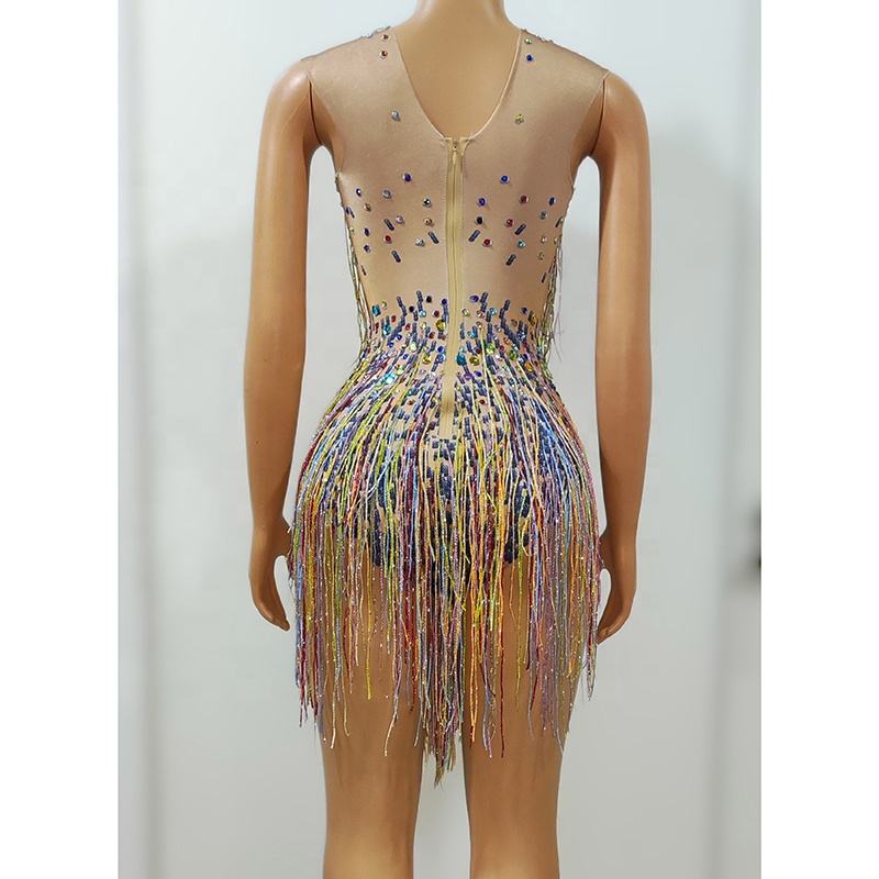 Sexy Sleeveless Sequins Tassel Stage Performance Short Jumpsuit Women Pole Dance Leotard Singer One Piece Bodysuit