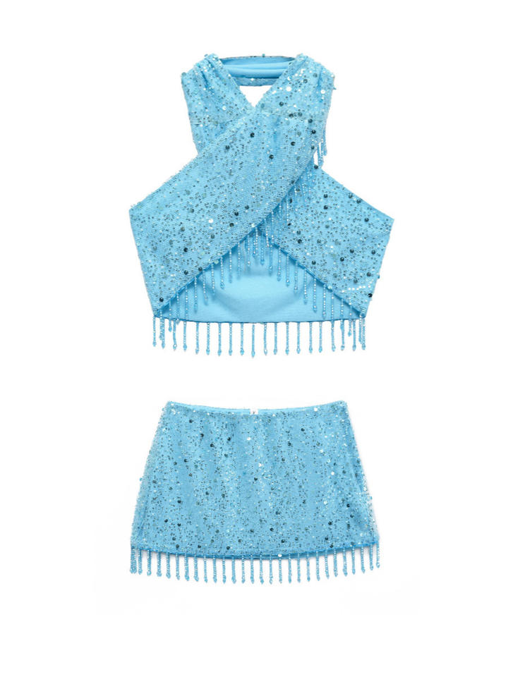 Completo Estivo Sexy da Donna: Top Corto con Perle e Paillettes e Gonna Sopra il Ginocchio, Traspirante e Intrecciato, Ideale per Feste