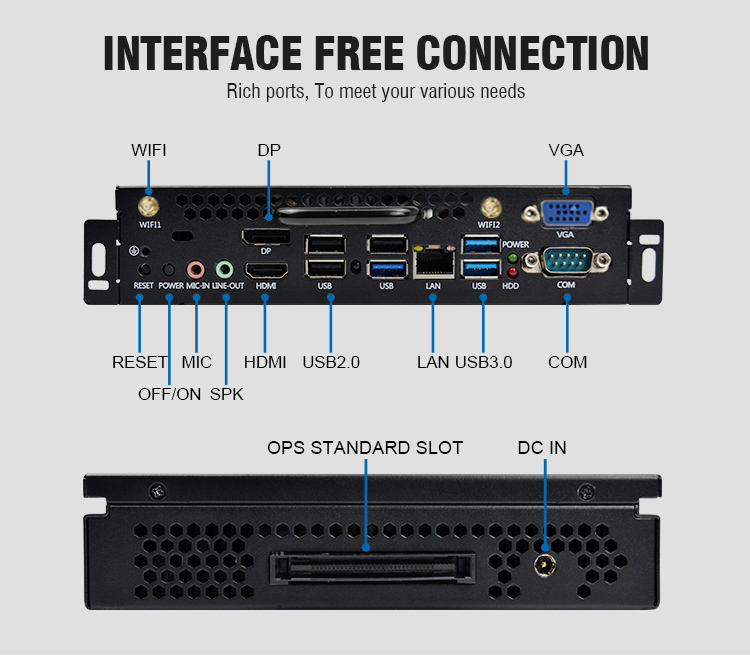 DC* 1, HDMI* 1, DP, USB3.0*3, USB2.0*3, RS232, RESET, ALIMENTAZIONE, VGA