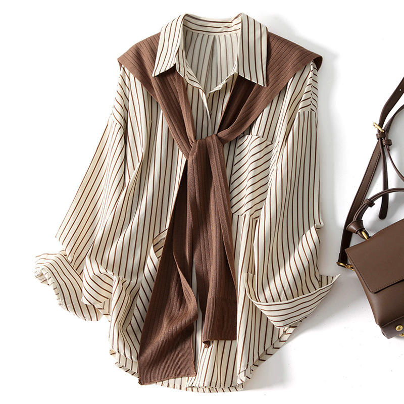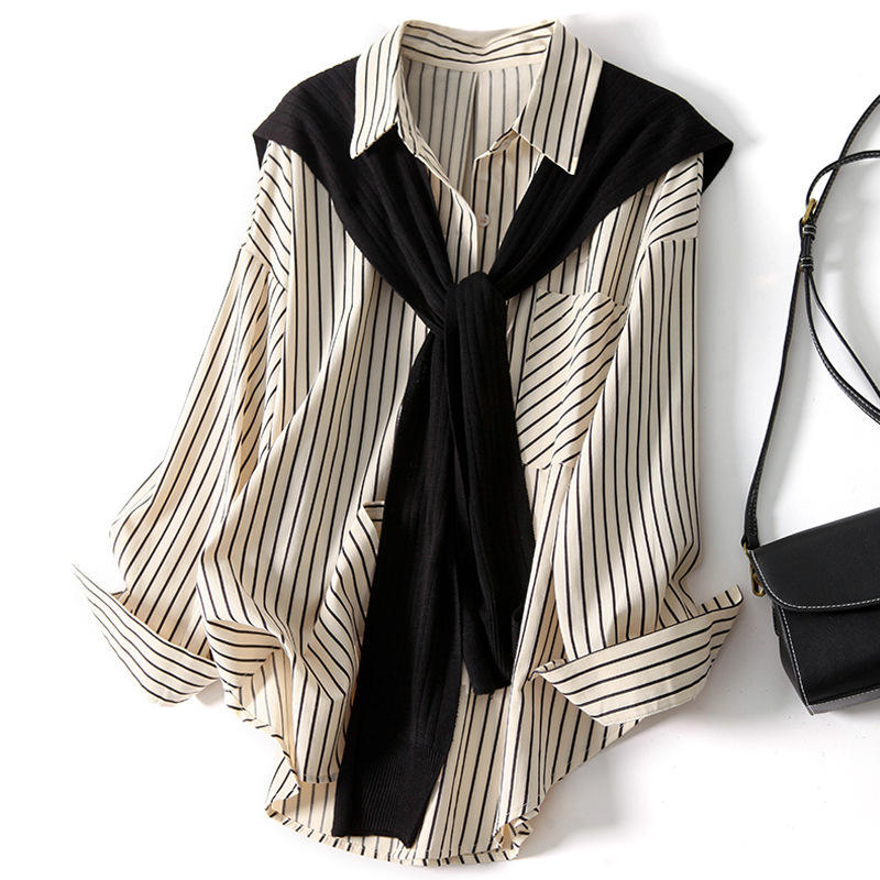 Shawl Stripe Shirt Women's Two-piece Topfashionable Autumn Lapel Long Sleeve Loose Shirts