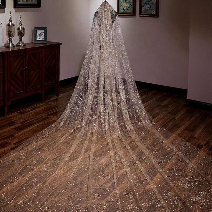 Shenglan Single Layer Wedding Veil Champagne Bridal Veil Lace BlingBling Lace Edge Bride Cathedral Wedding Dress
