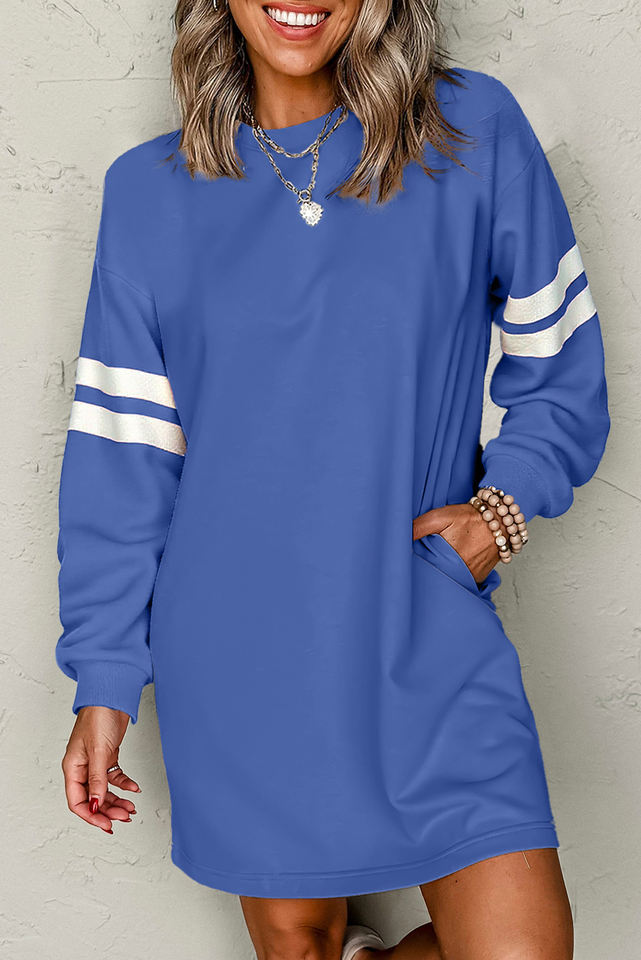 Shewin 2025 Women's Elegant Chic Varsity Stripe Sleeve Drop Shoulder Long Sleeve Sweatshirt Dress Women with Pockets