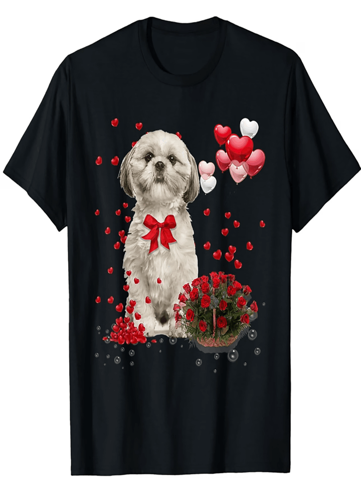 Shih Tzu Valentine's Day Dog Lover T-Shirt Black Casual Fit Crew Neck Printed Pattern For Adults