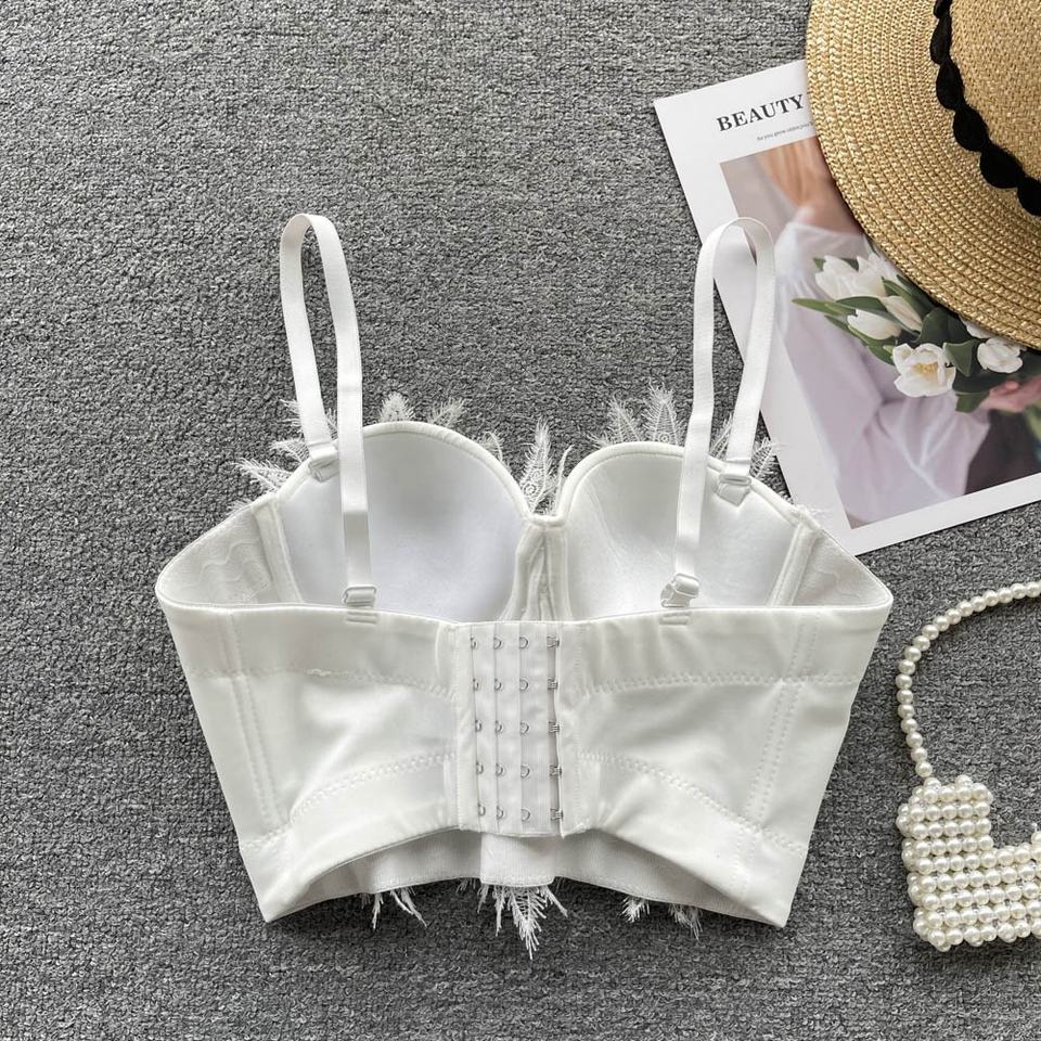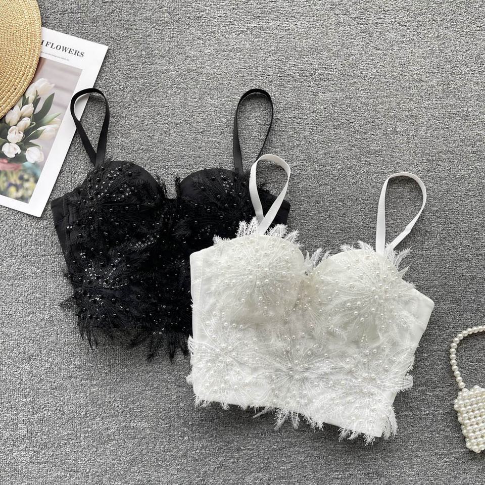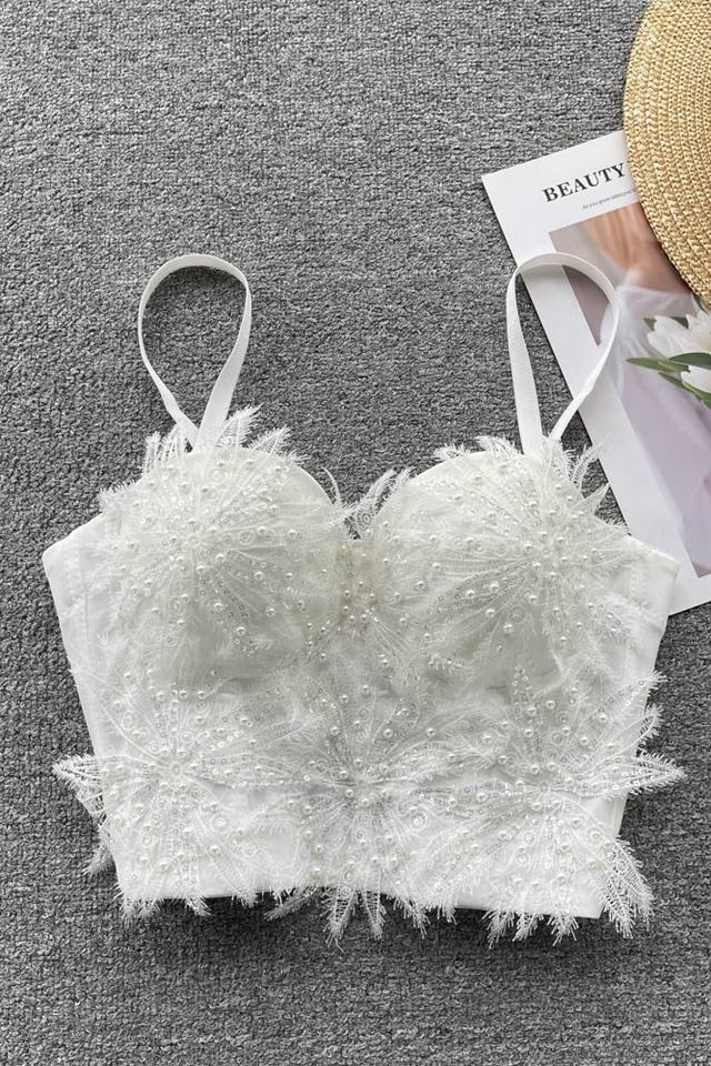 Shiny Luxury Pearl Embroidery Lace Tank Top Women Flower White Sling Wear Women Underwear Lingerie