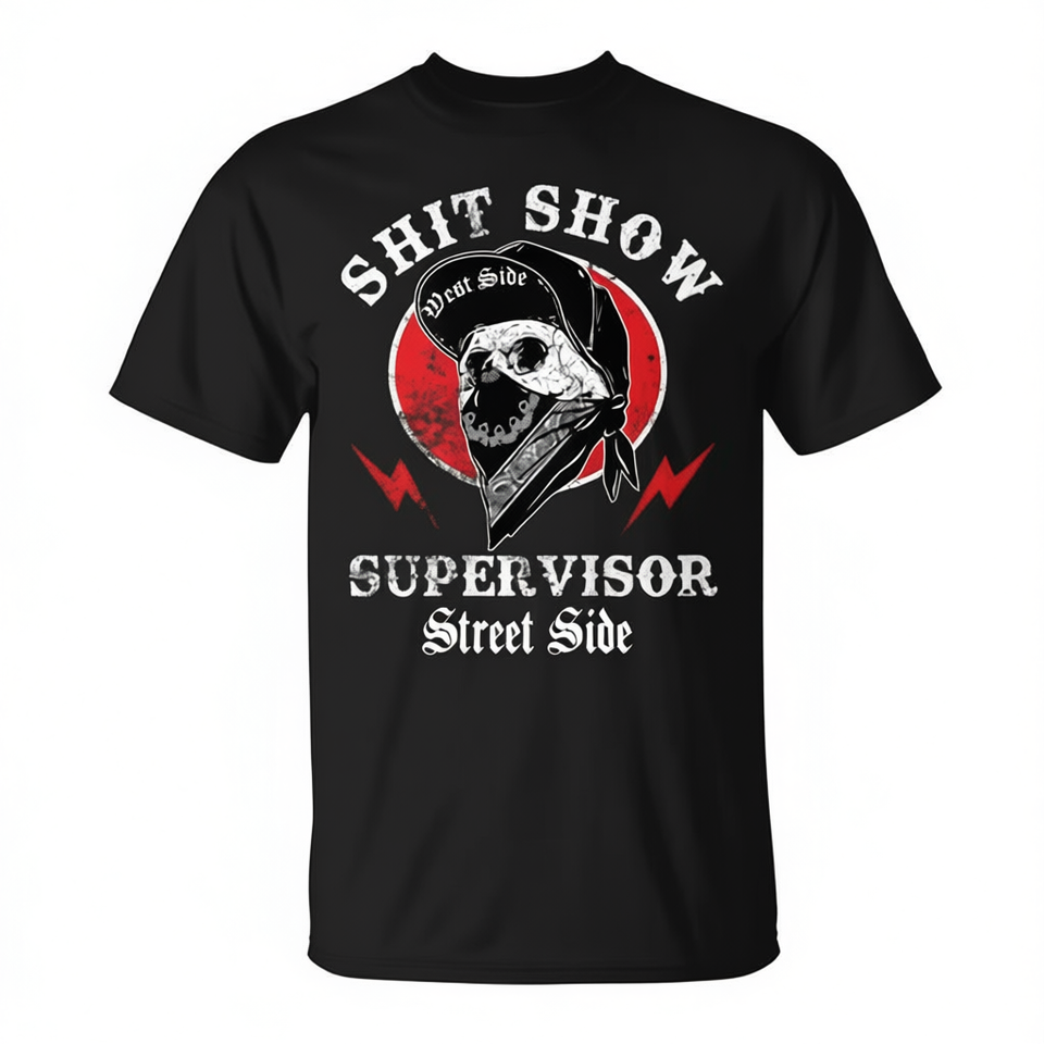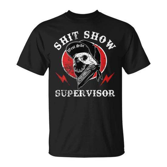T-shirt con stampa di un teschio 'Shit Show Supervisor', umoristica e sarcastica, nera, girocollo.