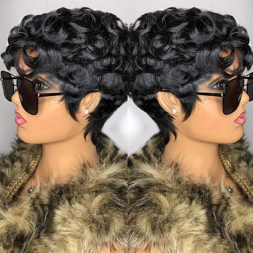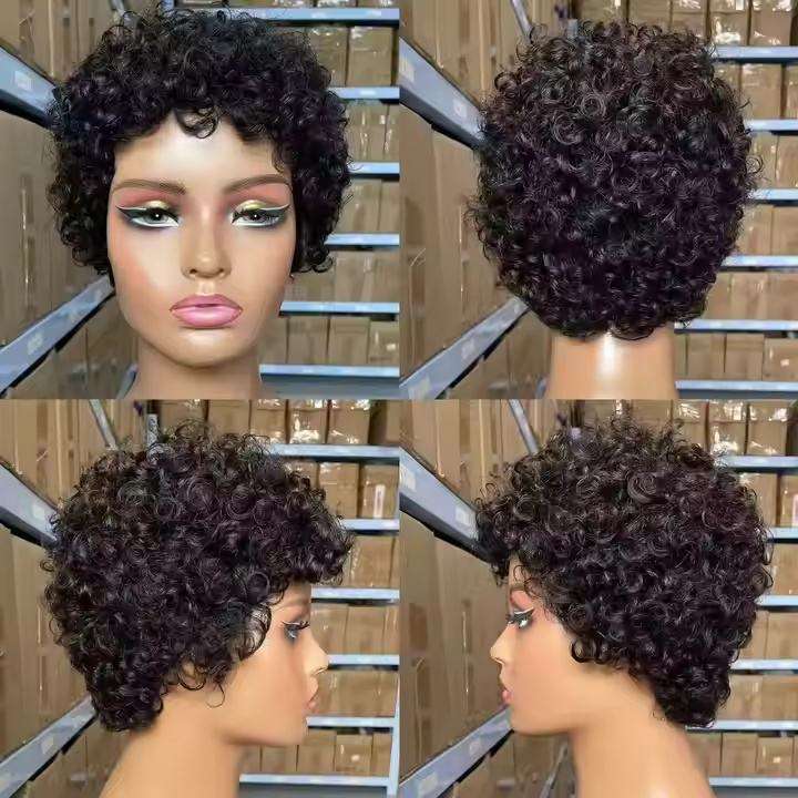 Parrucca Corta Pixie Riccia in Capelli Umani Vietnamiti, Senza Colla, Pre-Sfoltita, Nero Naturale, Taglio Pixie con Frangia per Donne di Colore