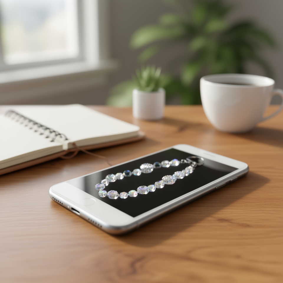 Braccialetto decorativo per cellulare in metallo con perline circolari scintillanti e ciondoli corti