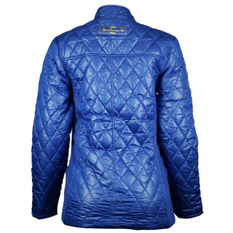 Giacca imbottita Sigma Gamma Rho SGRho blu reale 100 in poliestere trapuntato ricamato con cresta e capispalla di vita greca da sorellanza