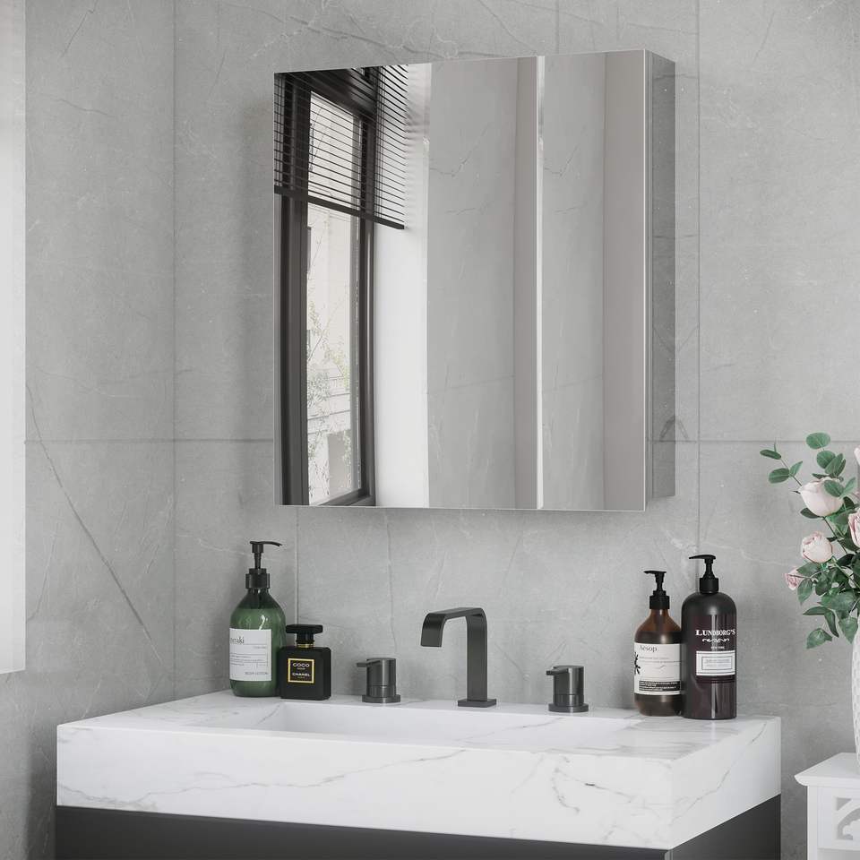 Armadietto a muro bagno in argento a 3 livelli con porte a battente a specchio e armadietto dei medicinali per bagni