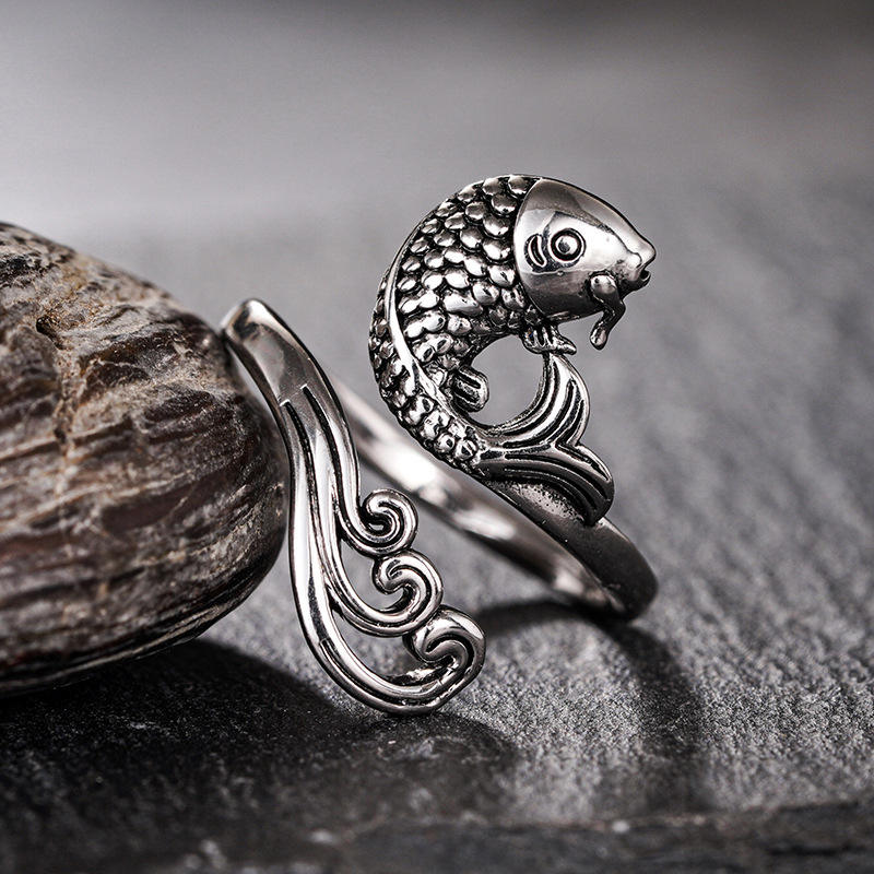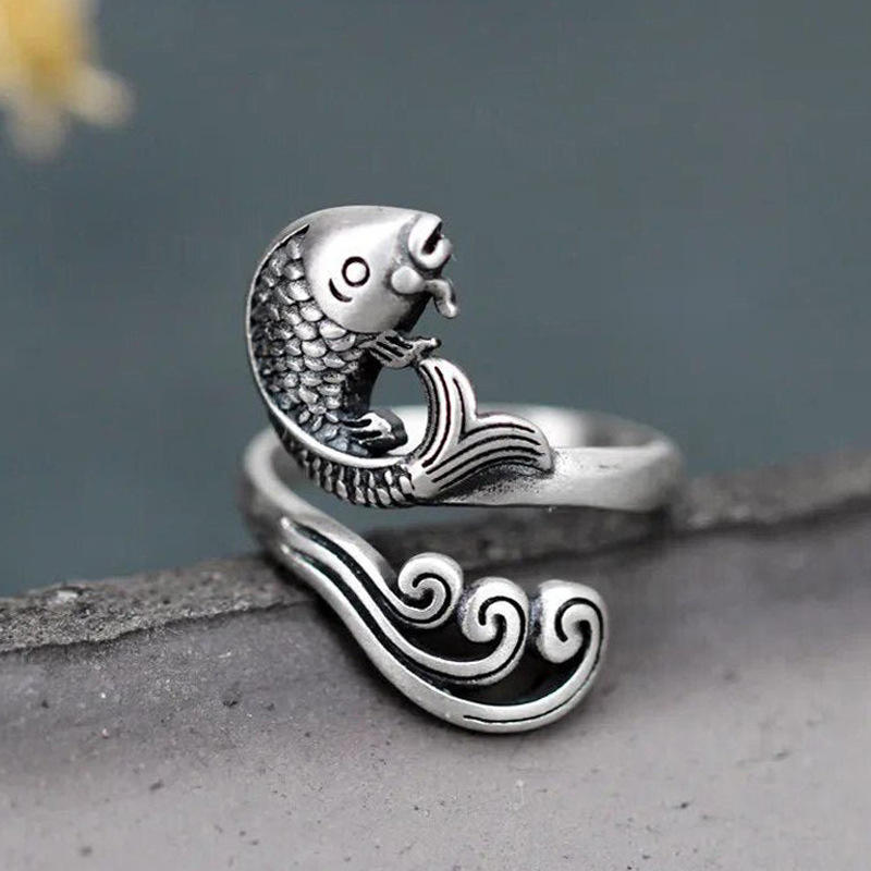 Anello a Forma di Pesce in Argento Placcato Anticato, Gioiello Unisex di Moda, Idea Regalo