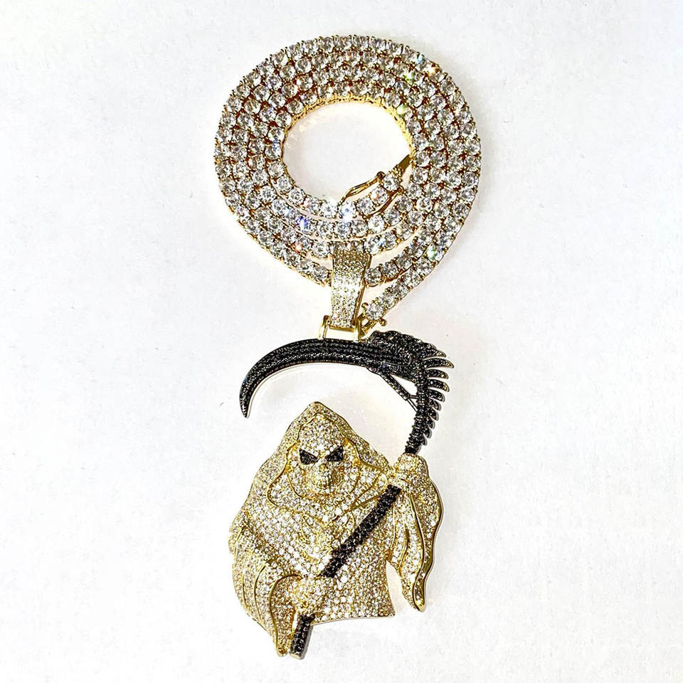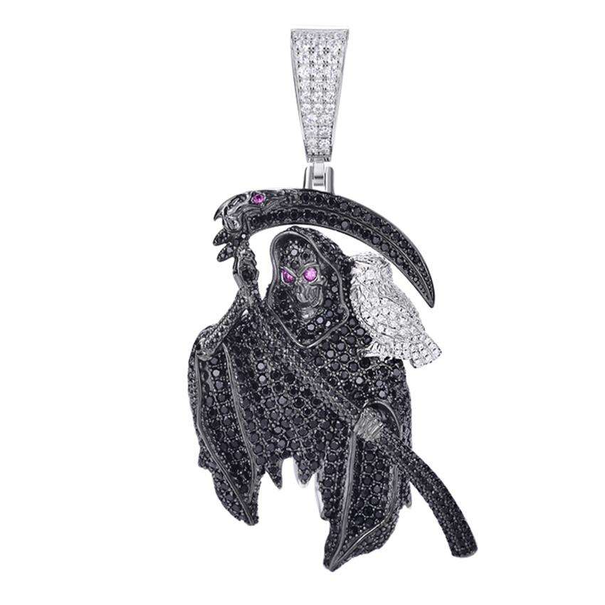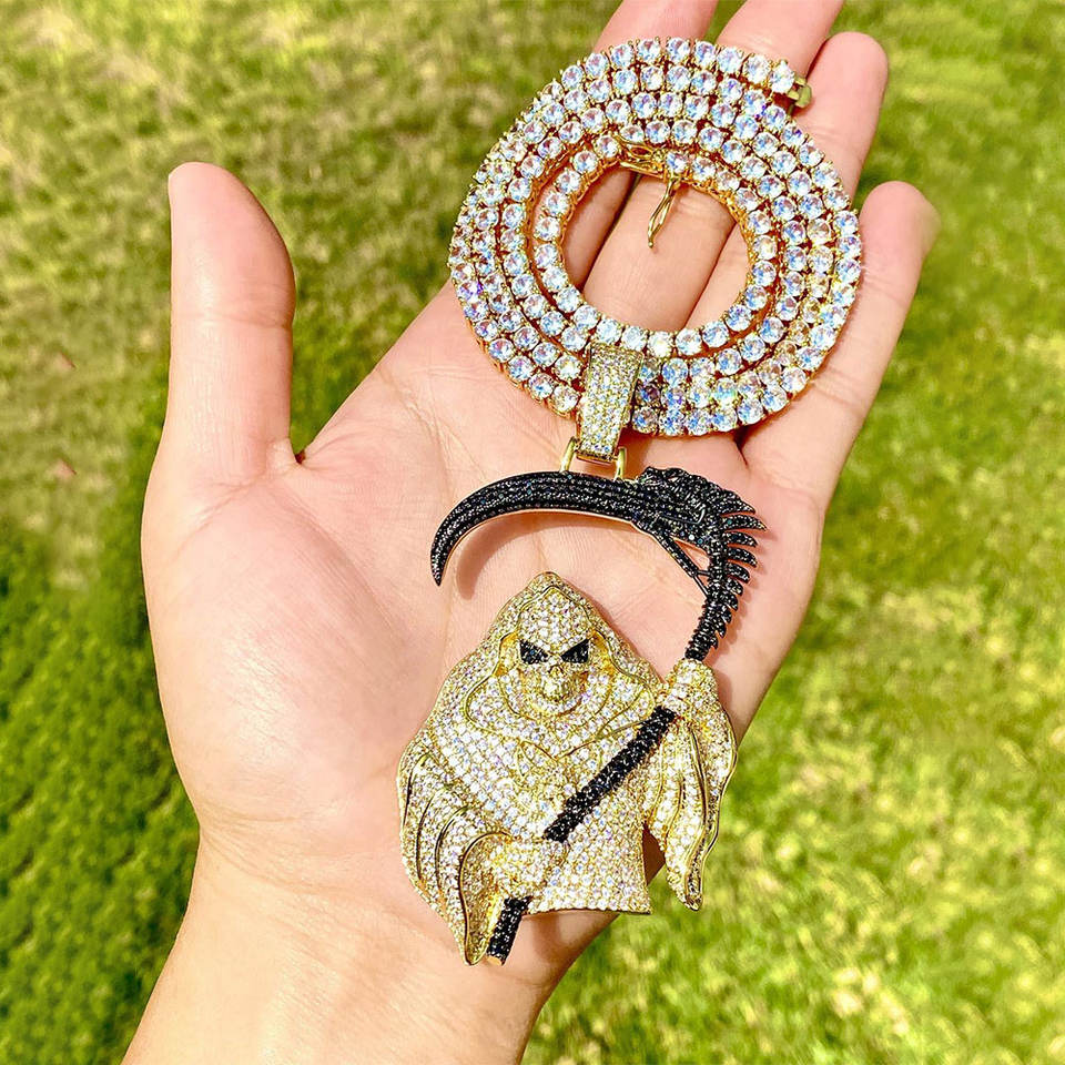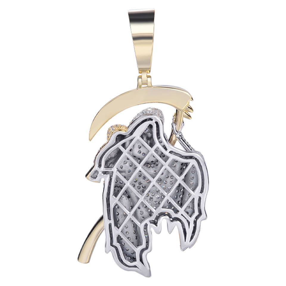 Ciondolo Teschio a Falce 3D Placcato Oro e Argento con Zirconi Cubici Micro-Incastonati, Gioiello Hip-Hop Luccicante per Uomo