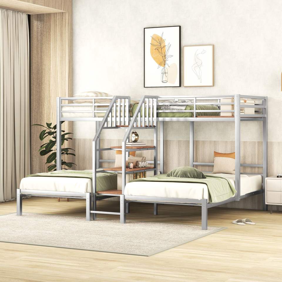 Letto a castello triplo in metallo argentato con ripiani contenitore e scala
