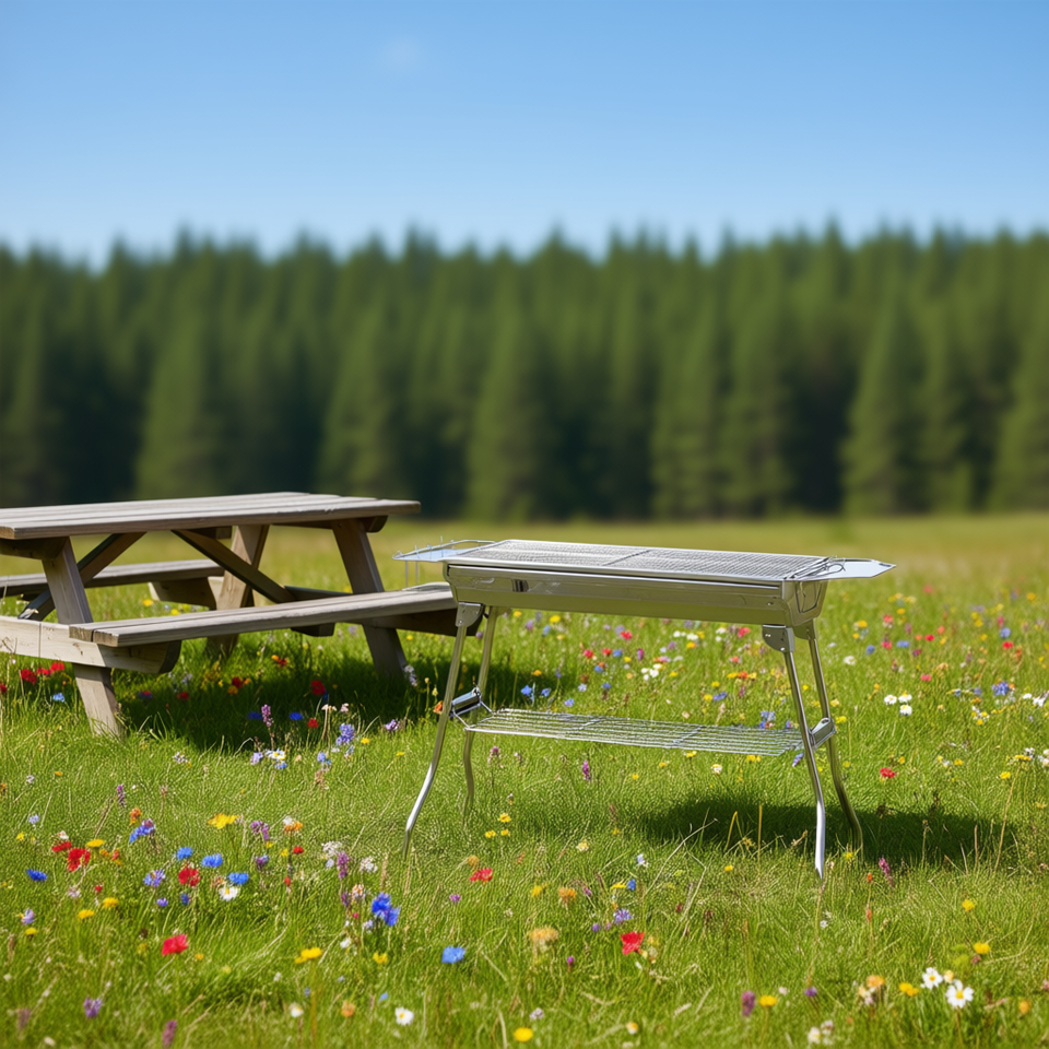 Silver Portable Stainless Steel Folding Charcoal BBQ Grill With Tool Holder For Outdoor Camping