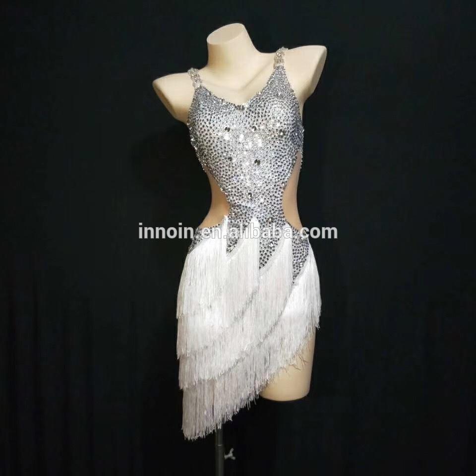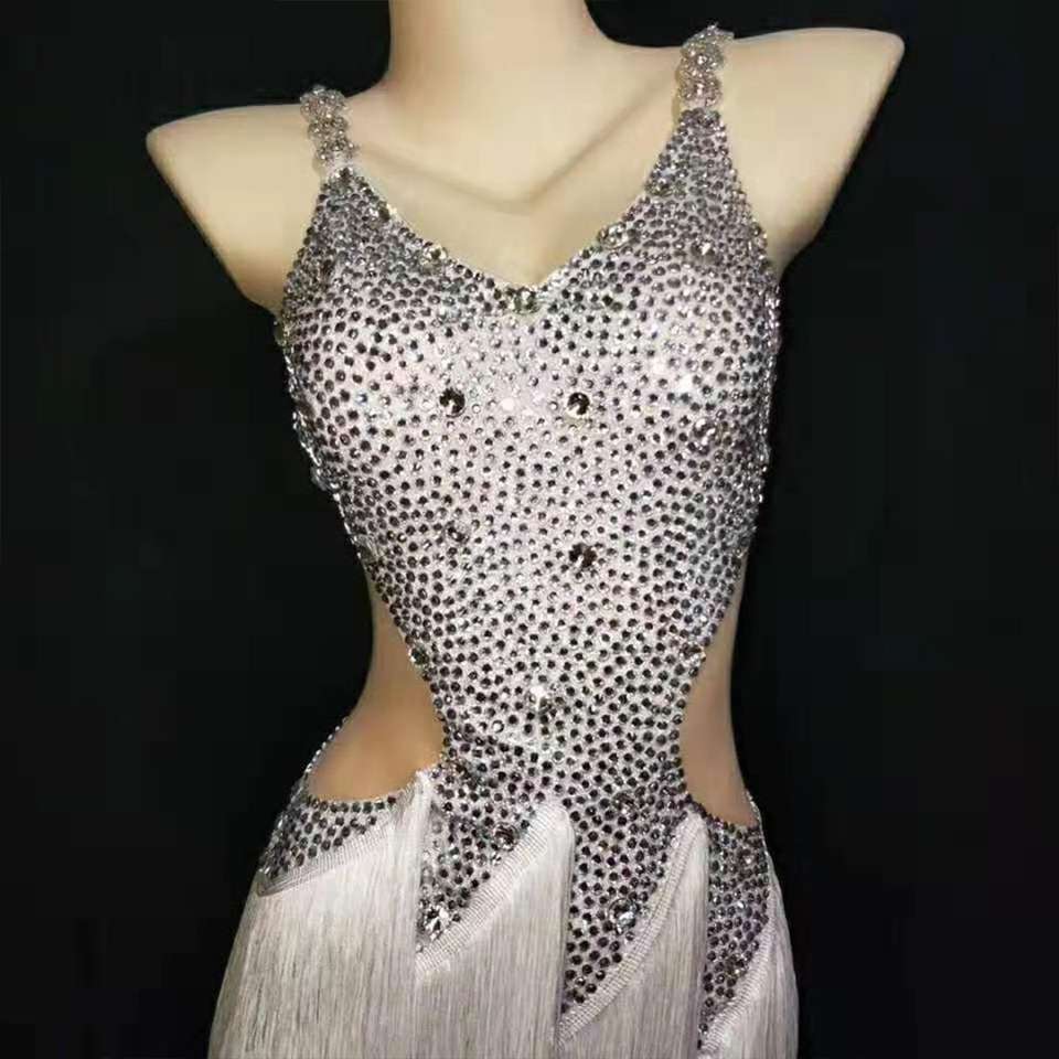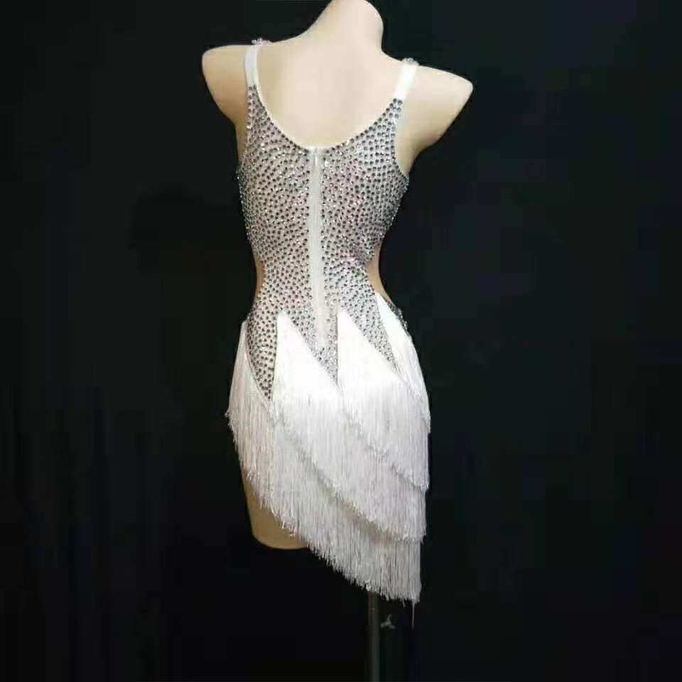 Abito Moderno con Frange di Cristallo e Strass, Senza Maniche, con Spalline Sottili, Personalizzabile per Feste, Costume da Ballo Latino