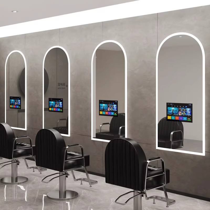 Semplice Postazione da Barbiere in Acciaio Inox, Attrezzatura per Salone, Specchio per Parrucchiere con TV e Luci da Parete